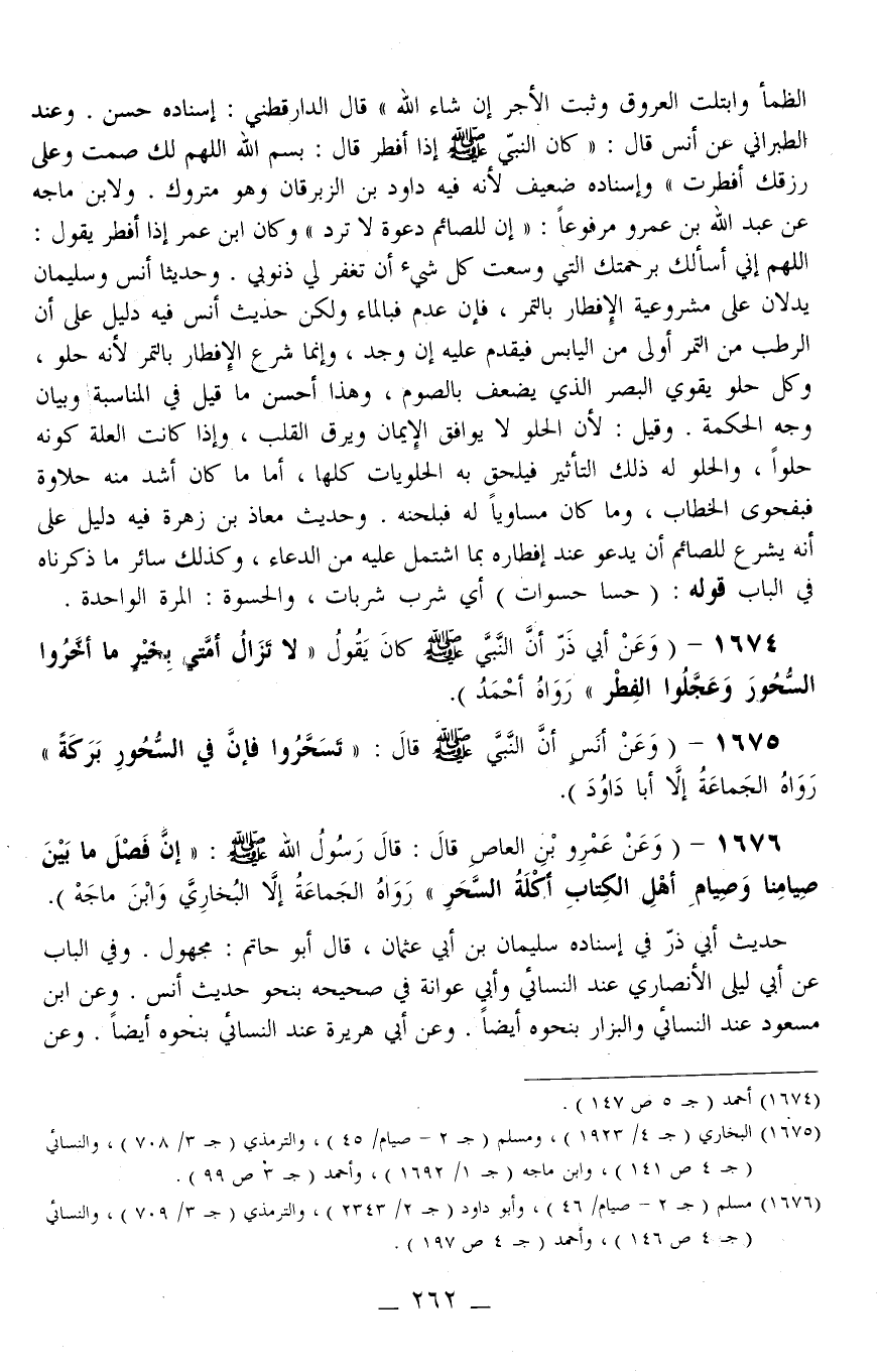 1676 - (وَعَنْ عَمْرِو بْنِ الْعَاصِ قَالَ: قَالَ رَسُولُ اللَّهِ - صَلَّى اللَّهُ عَلَيْهِ وَسَلَّمَ -: «إنَّ فَصْلَ مَا بَيْنَ صِيَامِنَا وَصِيَامِ أَهْلِ الْكِتَابِ أَكْلَةُ السَّحَرِ» رَوَاهُ الْجَمَاعَةُ إلَّا الْبُخَارِيَّ وَابْنَ مَاجَهْ)