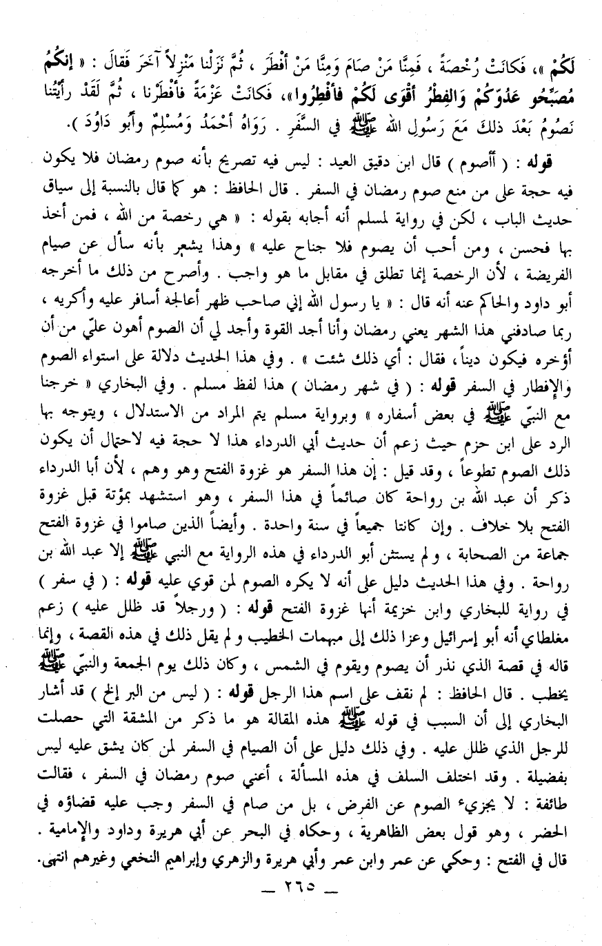 وَفِي الْبُخَارِيِّ " خَرَجْنَا مَعَ النَّبِيِّ فِي بَعْضِ أَسْفَارِهِ " وَبِرِوَايَةِ مُسْلِمٍ يُتِمُّ الْمُرَادَ مِنْ الِاسْتِدْلَالِ، وَيَتَوَجَّهُ بِهَا الرَّدُّ عَلَى ابْنِ حَزْمٍ حَيْثُ زَعَمَ أَنَّ حَدِيثَ أَبِي الدَّرْدَاءِ هَذَا لَا حُجَّةَ فِيهِ لِاحْتِمَالِ أَنْ يَكُونَ ذَلِكَ الصَّوْمُ تَطَوُّعًا، وَقَدْ قِيلَ: إنَّ هَذَا السَّفَرَ هُوَ غَزْوَةُ الْفَتْحِ وَهُوَ وَهْمٌ؛ لِأَنَّ أَبَا الدَّرْدَاءِ ذَكَرَ أَنَّ عَبْدَ اللَّهِ بْنَ رَوَاحَةَ كَانَ صَائِمًا فِي هَذَا السَّفَرِ، وَهُوَ اُسْتُشْهِدَ بِمُؤْتَةِ قَبْلَ غَزْوَةِ الْفَتْحِ بِلَا خِلَافٍ. وَإِنْ كَانَتَا جَمِيعًا فِي سَنَةٍ وَاحِدَةٍ. وَأَيْضًا الَّذِينَ صَامُوا فِي غَزْوَةِ الْفَتْحِ جَمَاعَةٌ مِنْ الصَّحَابَةِ، وَلَمْ يَسْتَثْنِ أَبُو الدَّرْدَاءِ فِي هَذِهِ الرِّوَايَةِ مَعَ النَّبِيِّ - صَلَّى اللَّهُ عَلَيْهِ وَسَلَّمَ - إلَّا عَبْدَ اللَّهِ بْنَ رَوَاحَةَ.
