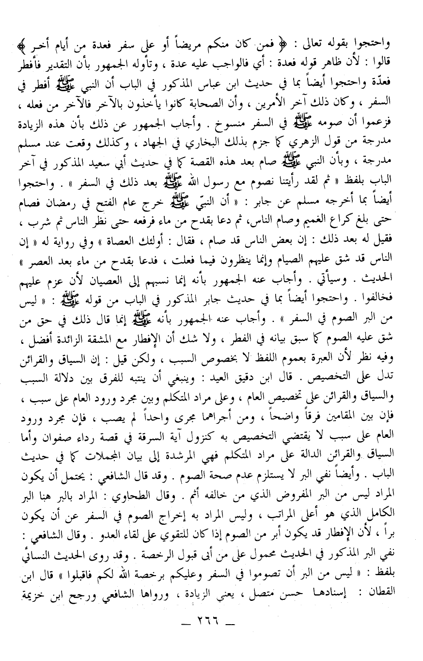 ـــــــــــــــــــــــــــــQوَاحْتَجُّوا بِقَوْلِهِ تَعَالَى: {فَمَنْ كَانَ مِنْكُمْ مَرِيضًا أَوْ عَلَى سَفَرٍ فَعِدَّةٌ مِنْ أَيَّامٍ أُخَرَ} [البقرة: 184] قَالُوا: لِأَنَّ ظَاهِرَ قَوْلِهِ فَعِدَّةٌ: أَيْ فَالْوَاجِبُ عَلَيْهِ عِدَّةٌ، وَتَأَوَّلَهُ الْجُمْهُورُ بِأَنَّ التَّقْدِيرَ فَأَفْطَرَ فَعِدَّةٌ وَاحْتَجُّوا أَيْضًا بِمَا فِي حَدِيثِ ابْنِ عَبَّاسٍ الْمَذْكُورِ فِي الْبَابِ أَنَّ النَّبِيَّ - صَلَّى اللَّهُ عَلَيْهِ وَسَلَّمَ - أَفْطَرَ فِي السَّفَرِ، وَكَانَ ذَلِكَ آخِرَ الْأَمْرَيْنِ، وَأَنَّ الصَّحَابَةَ كَانُوا يَأْخُذُونَ بِالْآخِرِ فَالْآخِرِ مِنْ فِعْلِهِ، فَزَعَمُوا أَنَّ صَوْمَهُ - صَلَّى اللَّهُ عَلَيْهِ وَسَلَّمَ - فِي السَّفَرِ مَنْسُوخٌ. وَأَجَابَ الْجُمْهُورُ عَنْ ذَلِكَ بِأَنَّ هَذِهِ الزِّيَادَةَ مُدْرَجَةٌ مِنْ قَوْلِ الزُّهْرِيِّ كَمَا جَزَمَ بِذَلِكَ الْبُخَارِيُّ فِي الْجِهَادِ، وَكَذَلِكَ وَقَعَتْ عِنْدَ مُسْلِمٍ مُدْرَجَةً، وَبِأَنَّ النَّبِيَّ - صَلَّى اللَّهُ عَلَيْهِ وَسَلَّمَ - صَامَ بَعْدَ هَذِهِ الْقِصَّةِ كَمَا فِي حَدِيثِ أَبِي سَعِيدٍ الْمَذْكُورِ فِي آخِرِ الْبَابِ بِلَفْظِ " ثُمَّ لَقَدْ رَأَيْتَنَا نَصُومُ مَعَ رَسُولِ اللَّهِ - صَلَّى اللَّهُ عَلَيْهِ وَسَلَّمَ - بَعْدَ ذَلِكَ فِي السَّفَرِ ". وَاحْتَجُّوا أَيْضًا بِمَا أَخْرَجَهُ مُسْلِمٌ عَنْ جَابِرٍ: «أَنَّ النَّبِيَّ - صَلَّى اللَّهُ عَلَيْهِ وَسَلَّمَ - خَرَجَ عَامَ الْفَتْحِ فِي رَمَضَانَ فَصَامَ حَتَّى بَلَغَ كُرَاعَ الْغَمِيمِ وَصَامَ النَّاسُ، ثُمَّ دَعَا بِقَدَحٍ مِنْ مَاءٍ فَرَفَعَهُ حَتَّى نَظَرَ النَّاسُ ثُمَّ شَرِبَ، فَقِيلَ لَهُ بَعْدَ ذَلِكَ: إنَّ بَعْضَ النَّاسِ قَدْ صَامَ، فَقَالَ: أُولَئِكَ الْعُصَاةُ» . وَفِي رِوَايَةٍ لَهُ «إنَّ النَّاسَ قَدْ شَقَّ عَلَيْهِمْ الصِّيَامُ وَإِنَّمَا يَنْظُرُونَ فِيمَا فَعَلْتُ، فَدَعَا بِقَدَحٍ مِنْ مَاءٍ بَعْدَ الْعَصْرِ» الْحَدِيثَ. وَسَيَأْتِي. وَأَجَابَ عَنْهُ الْجُمْهُورُ بِأَنَّهُ إنَّمَا نَسَبَهُمْ إلَى الْعِصْيَانِ لِأَنَّهُ عَزَمَ عَلَيْهِمْ فَخَالَفُوا. وَاحْتَجُّوا أَيْضًا بِمَا فِي حَدِيثِ جَابِرٍ الْمَذْكُورِ فِي الْبَابِ مِنْ قَوْلِهِ: - صَلَّى اللَّهُ عَلَيْهِ وَسَلَّمَ - «لَيْسَ مِنْ الْبِرِّ الصَّوْمُ فِي السَّفَرِ» . وَأَجَابَ عَنْهُ الْجُمْهُورُ بِأَنَّهُ - صَلَّى اللَّهُ عَلَيْهِ وَسَلَّمَ - إنَّمَا قَالَ ذَلِكَ فِي حَقِّ مَنْ شَقَّ عَلَيْهِ الصَّوْمُ كَمَا سَبَقَ بَيَانُهُ فِي الْفِطْرِ، وَلَا شَكَّ أَنَّ الْإِفْطَارَ مَعَ الْمَشَقَّةِ الزَّائِدَةِ أَفْضَلُ، وَفِيهِ نَظَرٌ لِأَنَّ الْعِبْرَةَ بِعُمُومِ اللَّفْظِ لَا بِخُصُوصِ السَّبَبِ، وَلَكِنْ قِيلَ: إنَّ السِّيَاقَ وَالْقَرَائِنَ. تَدُلُّ عَلَى التَّخْصِيصِ قَالَ ابْنُ دَقِيقِ الْعِيدِ: وَيَنْبَغِي أَنْ يَنْتَبِهَ لِلْفَرْقِ بَيْنَ دَلَالَةِ السَّبَبِ وَالسِّيَاقِ وَالْقَرَائِنِ عَلَى تَخْصِيصِ الْعَامِّ، وَعَلَى مُرَادِ الْمُتَكَلِّمِ وَبَيْنَ مُجَرَّدِ وُرُودِ الْعَامِّ عَلَى سَبَبٍ، فَإِنَّ بَيْنَ الْمَقَامَيْنِ فَرْقًا وَاضِحًا، وَمَنْ أَجْرَاهُمَا مَجْرًى وَاحِدًا لَمْ يُصِبْ، فَإِنَّ مُجَرَّدَ وُرُودِ الْعَامِّ عَلَى سَبَبٍ لَا يَقْتَضِي التَّخْصِيصَ بِهِ كَنُزُولِ آيَةِ السَّرِقَةِ فِي قِصَّةِ رِدَاءِ صَفْوَانَ وَأَمَّا السِّيَاقُ وَالْقَرَائِنُ الدَّالَّةُ عَلَى مُرَادِ الْمُتَكَلِّمِ فَهِيَ الْمُرْشِدَةُ إلَى بَيَانِ الْمُجْمَلَاتِ كَمَا فِي حَدِيثِ الْبَابِ. وَأَيْضًا نَفْيُ الْبِرِّ لَا يَسْتَلْزِمُ عَدَمَ صِحَّةِ الصَّوْمِ.
