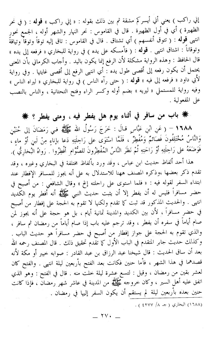 1688 - (عَنْ ابْنِ عَبَّاسٍ قَالَ: «خَرَجَ رَسُولُ اللَّهِ - صَلَّى اللَّهُ عَلَيْهِ وَسَلَّمَ - فِي رَمَضَانَ إلَى حُنَيْنٌ وَالنَّاسُ مُخْتَلِفُونَ فَصَائِمٌ وَمُفْطِرٌ، فَلَمَّا اسْتَوَى عَلَى رَاحِلَتِهِ دَعَا بِإِنَاءٍ مِنْ لَبَنٍ أَوْ مَاءٍ، فَوَضَعَهُ عَلَى رَاحِلَتِهِ أَوْ رَاحَتِهِ ثُمَّ نَظَرَ النَّاسُ الْمُفْطِرُونَ لِلصُّوَّامِ أَفْطِرُوا» رَوَاهُ الْبُخَارِيُّ)