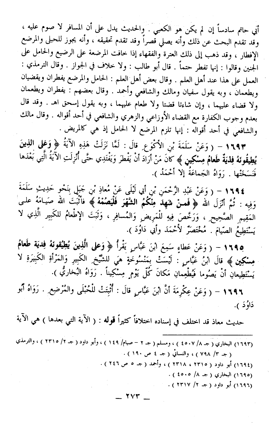 ـــــــــــــــــــــــــــــQابْنُ أَبِي حَاتِمٍ سَادِسًا إنْ لَمْ يَكُنْ هُوَ الْكَعْبِيُّ. الْحَدِيثُ يَدُلُّ عَلَى أَنَّ الْمُسَافِرَ لَا صَوْمَ عَلَيْهِ، وَقَدْ تَقَدَّمَ الْبَحْثُ عَنْ ذَلِكَ وَأَنَّهُ يُصَلِّي قَصْرًا وَقَدْ تَقَدَّمَ تَحْقِيقُهُ، وَأَنَّهُ يَجُوزُ لِلْحُبْلَى وَالْمُرْضِعِ الْإِفْطَارُ، وَقَدْ ذَهَبَ إلَى ذَلِكَ الْعِتْرَةُ وَالْفُقَهَاءُ إذَا خَافَتْ الْمُرْضِعَةُ عَلَى الرَّضِيعِ، وَالْحَامِلُ عَلَى الْجَنِينِ وَقَالُوا: إنَّهَا تُفْطِرُ حَتْمًا. قَالَ أَبُو طَالِبٍ: وَلَا خِلَافَ فِي الْجَوَازِ. وَقَالَ التِّرْمِذِيُّ: الْعَمَلُ عَلَى هَذَا عِنْدَ أَهْلِ الْعِلْمِ. وَقَالَ بَعْضُ أَهْلِ الْعِلْمِ: الْحَامِلُ وَالْمُرْضِعُ يُفْطِرَانِ وَيَقْضِيَانِ وَيُطْعِمَانِ، وَبِهِ يَقُولُ سُفْيَانُ وَمَالِكٌ وَالشَّافِعِيُّ وَأَحْمَدُ. وَقَالَ بَعْضُهُمْ: يُفْطِرَانِ وَيُطْعِمَانِ وَلَا قَضَاءَ عَلَيْهِمَا، وَإِنْ شَاءَتَا قَضَتَا وَلَا طَعَامَ عَلَيْهِمَا، وَبِهِ يَقُولُ إِسْحَاقُ اهـ. وَقَدْ قَالَ بِعَدَمِ وُجُوبِ الْكَفَّارَةِ مَعَ الْقَضَاءِ الْأَوْزَاعِيُّ وَالزُّهْرِيُّ وَالشَّافِعِيُّ فِي أَحَدِ أَقْوَالِهِ. وَقَالَ مَالِكٌ وَالشَّافِعِيُّ فِي أَحَدِ أَقْوَالِهِ: إنَّهَا تَلْزَمُ الْمُرْضِعَ لَا الْحَامِلَ إذْ هِيَ كَالْمَرِيضِ.