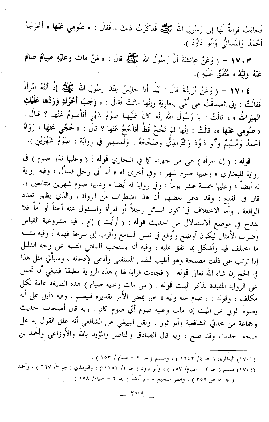 v. قَوْلُهُ: (إنَّ امْرَأَةً) هِيَ مِنْ جُهَيْنَةَ كَمَا فِي الْبُخَارِيِّ وَلَهُ: (وَعَلَيْهَا نَذْرُ صَوْمٍ) فِي رِوَايَةٍ لِلْبُخَارِيِّ " وَعَلَيْهَا صَوْمُ شَهْرٍ " وَفِي أُخْرَى لَهُ " أَنَّهُ أَتَى رَجُلٌ فَسَأَلَ " وَفِيهِ رِوَايَةٌ لَهُ أَيْضًا " وَعَلَيْهَا خَمْسَةَ عَشَرَ يَوْمًا " وَفِي رِوَايَةٍ لَهُ أَيْضًا " وَعَلَيْهَا صَوْمُ شَهْرَيْنِ مُتَتَابِعَيْنِ ". قَالَ فِي الْفَتْحِ: وَقَدْ ادَّعَى بَعْضُهُمْ أَنَّ هَذَا اضْطِرَابٌ مِنْ الرُّوَاةِ، وَاَلَّذِي يَظْهَرُ تَعَدُّدُ الْوَاقِعَةِ، وَأَمَّا الِاخْتِلَافُ فِي كَوْنِ السَّائِلِ رَجُلًا أَوْ امْرَأَةً وَالْمَسْئُولُ عَنْهُ أُخْتًا أَوْ أَمًّا فَلَا يَقْدَحُ فِي مَوْضِعِ الِاسْتِدْلَالِ مِنْ الْحَدِيثِ قَوْلُهُ: (أَرَأَيْتَ) . . . إلَخْ فِيهِ مَشْرُوعِيَّةُ الْقِيَاسِ وَضَرْبِ الْأَمْثَالِ لِيَكُونَ أَوْضَحَ وَأَوْقَعَ فِي نَفْسِ السَّامِعِ وَأَقْرَبَ إلَى سُرْعَةِ فَهْمِهِ وَفِيهِ تَشْبِيهُ مَا اُخْتُلِفَ فِيهِ وَأُشْكِلَ بِمَا اُتُّفِقَ عَلَيْهِ، وَفِيهِ أَنَّهُ يُسْتَحَبُّ لِلْمُفْتِي التَّنْبِيهُ عَلَى وَجْهِ الدَّلِيلِ إذَا تَرَتَّبَ عَلَى ذَلِكَ مَصْلَحَةٌ وَهُوَ أَطْيَبُ لِنَفْسِ الْمُسْتَفْتِي وَأَدْعَى لِإِذْعَانِهِ، وَسَيَأْتِي مِثْلُ هَذَا فِي الْحَجِّ إنْ شَاءَ اللَّهُ تَعَالَى قَوْلُهُ: (فَجَاءَتْ قَرَابَةٌ لَهَا) هَذِهِ الرِّوَايَةُ مُطْلَقَةٌ فَيَنْبَغِي أَنْ تُحْمَلَ عَلَى الرِّوَايَةِ الْمُقَيَّدَةِ بِذِكْرِ الْبِنْتِ قَوْلُهُ: (مَنْ مَاتَ وَعَلَيْهِ صِيَامٌ) هَذِهِ الصِّيغَةُ عَامَّةٌ لِكُلِّ مُكَلَّفٍ، وَقَوْلُهُ: " صَامَ عَنْهُ وَلِيُّهُ " خَبَرٌ بِمَعْنَى الْأَمْرِ تَقْدِيرُهُ فَلْيَصُمْ.