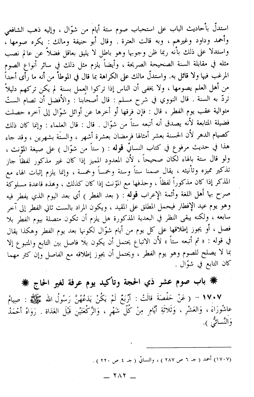 ـــــــــــــــــــــــــــــQاُسْتُدِلَّ بِأَحَادِيثِ الْبَابِ عَلَى اسْتِحْبَابِ صَوْمِ سِتَّةَ أَيَّامٍ مِنْ شَوَّالٍ، وَإِلَيْهِ ذَهَبَ الشَّافِعِيُّ وَأَحْمَدُ وَدَاوُد وَغَيْرُهُمْ، وَبِهِ قَالَتْ الْعِتْرَةُ. وَقَالَ أَبُو حَنِيفَةَ وَمَالِكٌ: يُكْرَهُ صَوْمُهَا، وَاسْتَدَلَّا عَلَى ذَلِكَ بِأَنَّهُ رُبَّمَا ظَنَّ وُجُوبَهَا وَهُوَ بَاطِلٌ لَا يَلِيقُ بِعَاقِلٍ فَضْلًا عَنْ عَالِمٍ نَصَّبَ مِثْلَهُ فِي مُقَابَلَةِ السُّنَّةِ الصَّحِيحَةِ الصَّرِيحَةِ، وَأَيْضًا يَلْزَمُ مِثْلُ ذَلِكَ فِي سَائِرِ أَنْوَاعِ الصَّوْمِ الْمُرَغَّبِ فِيهَا وَلَا قَائِلَ بِهِ.