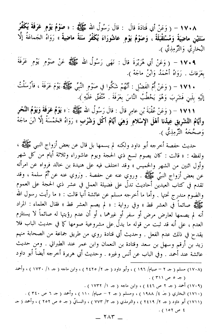 . حَدِيثُ حَفْصَةَ أَخْرَجَهُ أَبُو دَاوُد وَلَكِنَّهُ لَمْ يُسَمِّهَا بَلْ قَالَ عَنْ بَعْضِ أَزْوَاجِ النَّبِيِّ - صَلَّى اللَّهُ عَلَيْهِ وَسَلَّمَ -، وَلَفْظُهُ: قَالَتْ: «كَانَ يَصُومُ تِسْعَ ذِي الْحِجَّةِ وَيَوْمَ عَاشُورَاءَ وَثَلَاثَةَ أَيَّامٍ مِنْ كُلِّ شَهْرٍ وَأَوَّلَ اثْنَيْنِ مِنْ الشَّهْرِ وَالْخَمِيسِ» وَقَدْ اُخْتُلِفَ فِيهِ عَلَى هُنَيْدَةَ بْنِ خَالِدٍ فَرَوَاهُ عَنْ امْرَأَتِهِ عَنْ بَعْضِ أَزْوَاجِ النَّبِيِّ - صَلَّى اللَّهُ عَلَيْهِ وَسَلَّمَ -.