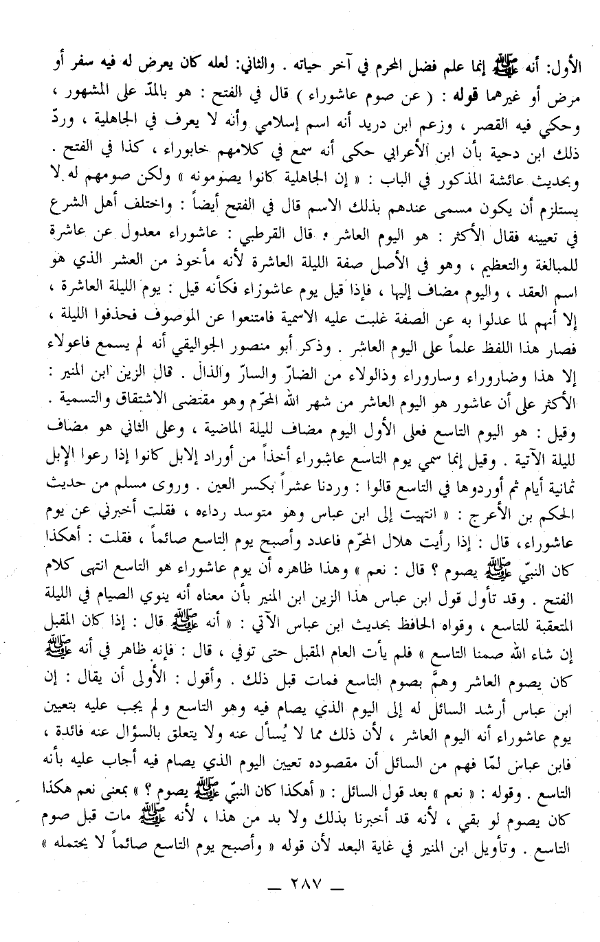 وَرَوَى مُسْلِمٌ مِنْ حَدِيثِ الْحَكَمِ بْنِ الْأَعْرَجِ: «انْتَهَيْت إلَى ابْنِ عَبَّاسٍ وَهُوَ مُتَوَسِّدٌ رِدَاءَهُ، فَقُلْتُ أَخْبِرْنِي عَنْ يَوْمِ عَاشُورَاءَ، قَالَ: إذَا رَأَيْتَ هِلَالَ الْمُحَرَّمِ فَاعْدُدْ وَأَصْبِحْ يَوْمَ التَّاسِعِ صَائِمًا، فَقُلْتُ: أَهَكَذَا كَانَ النَّبِيُّ - صَلَّى اللَّهُ عَلَيْهِ وَسَلَّمَ - يَصُومُ؟ قَالَ: نَعَمْ» وَهَذَا ظَاهِرُهُ أَنَّ يَوْمَ عَاشُورَاءَ هُوَ التَّاسِعُ انْتَهَى كَلَامُ الْفَتْحِ. وَقَدْ تَأَوَّلَ قَوْلَ ابْنِ عَبَّاسٍ هَذَا الزَّيْنُ بْنُ الْمُنِيرِ بِأَنَّ مَعْنَاهُ أَنَّهُ يَنْوِي الصِّيَامَ فِي اللَّيْلَةِ الْمُتَعَقِّبَةِ لِلتَّاسِعِ، وَقَوَّاهُ الْحَافِظُ بِحَدِيثِ ابْنِ عَبَّاسٍ الْآتِي: أَنَّهُ - صَلَّى اللَّهُ عَلَيْهِ وَسَلَّمَ - قَالَ: «إذَا كَانَ الْمُقْبِلُ إنْ شَاءَ اللَّهُ صُمْنَا التَّاسِعَ فَلَمْ يَأْتِ الْعَامُ الْمُقْبِلُ حَتَّى تُوُفِّيَ» ، قَالَ: فَإِنَّهُ ظَاهِرٌ فِي أَنَّهُ - صَلَّى اللَّهُ عَلَيْهِ وَسَلَّمَ - كَانَ يَصُومُ الْعَاشِرَ وَهَمَّ بِصَوْمِ التَّاسِعِ فَمَاتَ قَبْلَ ذَلِكَ.