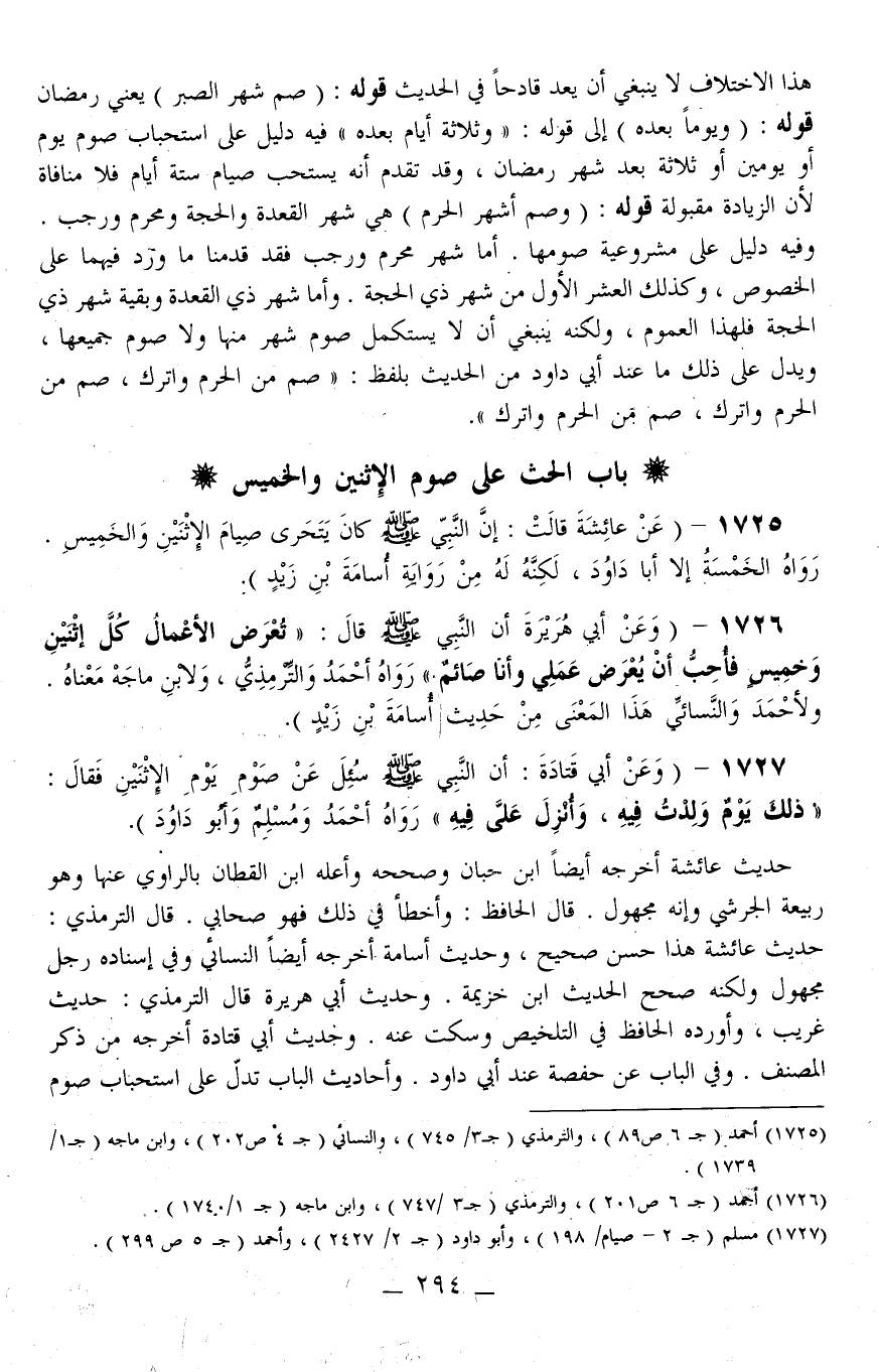 وَفِيهِ دَلِيلٌ عَلَى مَشْرُوعِيَّةِ صَوْمِهَا. أَمَّا شَهْرُ مُحَرَّمٍ وَرَجَبٍ فَقَدْ قَدَّمْنَا مَا وَرَدَ فِيهِمَا عَلَى الْخُصُوصِ، وَكَذَلِكَ الْعَشْرُ الْأُوَلُ مِنْ شَهْرِ ذِي الْحِجَّةِ. وَأَمَّا شَهْرُ ذِي الْقِعْدَةِ وَبَقِيَّةُ شَهْرِ ذِي الْحِجَّةِ فَلِهَذَا الْعُمُومِ، وَلَكِنَّهُ يَنْبَغِي أَنْ لَا يُسْتَكْمَلَ صَوْمُ شَهْرٍ مِنْهَا وَلَا صَوْمُ جَمِيعِهَا، وَيَدُلُّ عَلَى ذَلِكَ مَا عِنْدَ أَبِي دَاوُد مِنْ الْحَدِيثِ بِلَفْظِ: «صُمْ مِنْ الْحُرُمِ وَاتْرُكْ، صُمْ مِنْ الْحُرُمِ وَاتْرُكْ، صُمْ مِنْ الْحُرُمِ وَاتْرُكْ» .