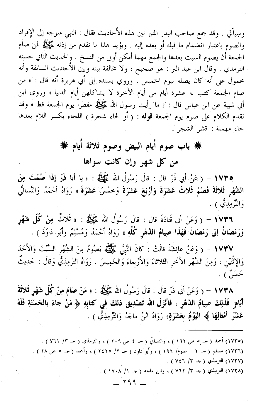 1735 - (عَنْ أَبِي ذَرٍّ قَالَ: قَالَ رَسُولُ اللَّهِ - صَلَّى اللَّهُ عَلَيْهِ وَسَلَّمَ -: «يَا أَبَا ذَرٍّ إذَا صُمْتَ مِنْ الشَّهْرِ ثَلَاثَةً فَصُمْ ثَلَاثَ عَشَرَةَ وَأَرْبَعَ عَشَرَةَ وَخَمْسَ عَشَرَةَ» رَوَاهُ أَحْمَدُ وَالنَّسَائِيُّ وَالتِّرْمِذِيُّ) .