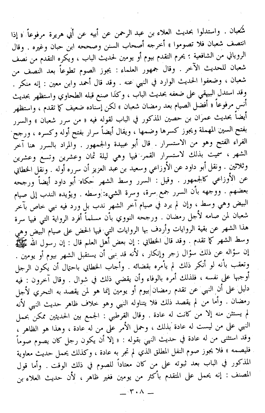 وَقَالَ الرُّويَانِيُّ مِنْ الشَّافِعِيَّةِ. يَحْرُمُ التَّقَدُّمُ بِيَوْمٍ أَوْ يَوْمَيْنِ لِحَدِيثِ الْبَابِ، وَيُكْرَهُ التَّقَدُّمَ مِنْ نِصْفِ شَعْبَانَ لِلْحَدِيثِ الْآخَرِ. وَقَالَ جُمْهُورُ الْعُلَمَاءِ: يَجُوزُ الصَّوْمُ تَطَوُّعًا بَعْدَ النِّصْفِ مِنْ شَعْبَانَ، وَضَعَّفُوا الْحَدِيثَ الْوَارِدَ فِي النَّهْيِ عَنْهُ. وَقَدْ قَالَ أَحْمَدُ وَابْنُ مَعِينٍ: إنَّهُ مُنْكَرٌ. وَقَدْ اسْتَدَلَّ الْبَيْهَقِيُّ عَلَى ضَعْفِهِ بِحَدِيثِ الْبَابِ، وَكَذَا صَنَعَ قَبْلَهُ الطَّحَاوِيُّ وَاسْتَظْهَرَ بِحَدِيثِ أَنَسٍ مَرْفُوعًا «أَفْضَلُ الصِّيَامِ بَعْدَ رَمَضَانَ شَعْبَانُ» لَكِنَّ إسْنَادَهُ ضَعِيفٌ كَمَا تَقَدَّمَ، وَاسْتَظْهَرَ أَيْضًا بِحَدِيثِ عِمْرَانَ بْنِ حُصَيْنٍ الْمَذْكُورِ فِي الْبَابِ لِقَوْلِهِ فِيهِ " مِنْ سَرَرِ شَعْبَانَ وَالسَّرَرُ بِفَتْحِ السِّينِ الْمُهْمَلَةِ وَيَجُوزُ كَسْرُهَا وَضَمُّهَا، وَيُقَالُ أَيْضًا سِرَارٌ بِفَتْحِ أَوَّلِهِ وَكَسْرِهِ، وَرَجَّحَ الْفَرَّاءُ الْفَتْحَ وَهُوَ مِنْ الِاسْتِسْرَارِ. قَالَ أَبُو عُبَيْدَةَ وَالْجُمْهُورُ. وَالْمُرَادُ بِالسَّرَرِ هُنَا آخِرُ الشَّهْرِ، سُمِّيَتْ بِذَلِكَ لِاسْتِسْرَارِ الْقَمَرِ فِيهَا وَهِيَ لَيْلَةُ ثَمَانٍ وَعِشْرِينَ وَتِسْعٍ وَعِشْرِينَ وَثَلَاثِينَ. وَنَقَلَ أَبُو دَاوُد عَنْ الْأَوْزَاعِيِّ وَسَعِيدِ بْنِ عَبْدِ الْعَزِيزِ أَنَّ سَرَرَهُ أَوَّلُهُ. وَنَقَلَ الْخَطَّابِيِّ عَنْ الْأَوْزَاعِيِّ كَالْجُمْهُورِ. وَقِيلَ: السَّرَرُ وَسَطُ الشَّهْرِ حَكَاهُ. أَبُو دَاوُد أَيْضًا وَرَجَّحَهُ بَعْضُهُمْ. وَوَجَّهَهُ بِأَنَّ السَّرَرَ جَمْعُ سُرَّةٍ، وَسُرَّةُ الشَّيْءِ: وَسَطُهُ. وَيُؤَيِّدُهُ النَّدْبُ إلَى صِيَامِ الْبِيضِ وَهِيَ وَسَطٌ، وَإِنْ لَمْ يَرِدْ فِي صِيَامِ آخِرِ الشَّهْرِ نَدْبٌ بَلْ وَرَدَ فِيهِ نَهْيٌ خَاصٌّ بِآخِرِ شَعْبَانَ لَمَنْ صَامَهُ لِأَجْلِ رَمَضَانَ. وَرَجَّحَهُ النَّوَوِيُّ بِأَنَّ مُسْلِمًا أَفْرَدَ الرِّوَايَةَ الَّتِي فِيهَا سُرَّةُ هَذَا الشَّهْرِ عَنْ بَقِيَّةِ الرِّوَايَاتِ وَأَرْدَفَ بِهَا الرِّوَايَاتِ الَّتِي فِيهَا الْحَضُّ عَلَى صِيَامِ الْبِيضِ وَهِيَ وَسَطُ الشَّهْرِ كَمَا تَقَدَّمَ. وَقَدْ قَالَ الْخَطَّابِيِّ: إنَّ بَعْضَ أَهْلِ الْعِلْمِ قَالَ: إنَّ رَسُولَ اللَّهِ - صَلَّى اللَّهُ عَلَيْهِ وَسَلَّمَ - إنَّ سُؤَالَهُ عَنْ ذَلِكَ سُؤَالُ زَجْرٍ وَإِنْكَارٍ؛ لِأَنَّهُ قَدْ نَهَى أَنْ يُسْتَقْبَلَ الشَّهْرُ بِيَوْمٍ أَوْ يَوْمَيْنِ. وَتُعُقِّبَ بِأَنَّهُ لَوْ أَنْكَرَ ذَلِكَ لَمْ يَأْمُرْهُ بِقَضَائِهِ. وَأَجَابَ الْخَطَّابِيِّ بِاحْتِمَالِ أَنْ يَكُونَ الرَّجُلُ أَوْجَبَهَا عَلَى نَفْسِهِ، فَلِذَلِكَ أَمَرَهُ بِالْوَفَاءِ وَأَنْ يَقْضِيَ ذَلِكَ فِي شَوَّالٍ. وَقَالَ آخَرُونَ: فِيهِ دَلِيلٌ عَلَى أَنَّ النَّهْيَ عَنْ تَقَدُّمِ رَمَضَانَ بِيَوْمٍ أَوْ يَوْمَيْنِ إنَّمَا هُوَ لِمَنْ يَقْصِدُ بِهِ التَّحَرِّيَ لِأَجْلِ رَمَضَانَ. وَأَمَّا مَنْ لَمْ يَقْصِدْ ذَلِكَ فَلَا يَتَنَاوَلُهُ النَّهْيُ وَهُوَ خِلَافُ ظَاهِرِ حَدِيثِ النَّهْيِ لِأَنَّهُ لَمْ يَسْتَثْنِ مِنْهُ إلَّا مَنْ كَانَتْ لَهُ عَادَةٌ. وَقَالَ الْقُرْطُبِيُّ: الْجَمْعُ بَيْنَ الْحَدِيثَيْنِ مُمْكِنٌ بِحَمْلِ النَّهْيِ عَلَى مَنْ لَيْسَتْ لَهُ عَادَةٌ بِذَلِكَ، وَحَمْلُ الْأَمْرِ عَلَى مَنْ لَهُ عَادَةٌ، وَهَذَا هُوَ الظَّاهِرُ، وَقَدْ اسْتَثْنَى مَنْ لَهُ عَادَةٌ فِي حَدِيثِ النَّهْيِ بِقَوْلِهِ: " إلَّا أَنْ يَكُونَ رَجُلٌ كَانَ يَصُومُ صَوْمًا فَلْيَصُمْهُ " فَلَا يَجُوزُ صَوْمُ النَّفْلِ الْمُطْلَقِ الَّذِي لَمْ تَجْرِ بِهِ عَادَةٌ، وَكَذَلِكَ يُحْمَلُ حَدِيثُ 