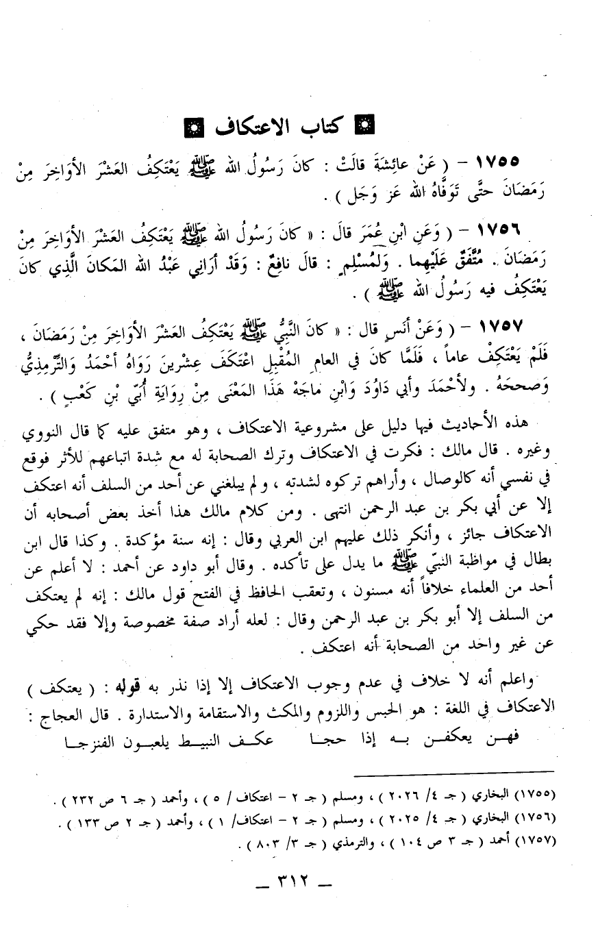 . هَذِهِ الْأَحَادِيثُ فِيهَا دَلِيلٌ عَلَى مَشْرُوعِيَّةِ الِاعْتِكَافِ، وَهُوَ مُتَّفَقٌ عَلَيْهَا كَمَا قَالَ النَّوَوِيُّ وَغَيْرُهُ. قَالَ مَالِكٌ: فَكَّرْتُ فِي الِاعْتِكَافِ وَتَرْكِ الصَّحَابَةِ لَهُ مَعَ شِدَّةِ اتِّبَاعِهِمْ لِلْأَثَرِ فَوَقَعَ فِي نَفْسِي أَنَّهُ كَالْوِصَالِ، وَأُرَاهُمْ تَرَكُوهُ لِشِدَّتِهِ، وَلَمْ يَبْلُغْنِي عَنْ أَحَدٍ مِنْ السَّلَفِ أَنَّهُ اعْتَكَفَ إلَّا عَنْ أَبِي بَكْرِ بْنِ عَبْدِ الرَّحْمَنِ انْتَهَى. وَمِنْ كَلَامِ مَالِكٍ هَذَا أَخَذَ بَعْضُ أَصْحَابِهِ أَنَّ الِاعْتِكَافَ جَائِزٌ، وَأَنْكَرَ ذَلِكَ عَلَيْهِمْ ابْنُ الْعَرَبِيِّ وَقَالَ: إنَّهُ سُنَّةٌ مُؤَكَّدَةٌ. وَكَذَا قَالَ ابْنُ بَطَّالٍ فِي مُوَاظَبَةِ النَّبِيِّ - صَلَّى اللَّهُ عَلَيْهِ وَسَلَّمَ - مَا يَدُلُّ عَلَى تَأَكُّدِهِ. وَقَالَ أَبُو دَاوُد عَنْ أَحْمَدَ: لَا أَعْلَمُ عَنْ أَحَدٍ مِنْ الْعُلَمَاءِ خِلَافًا أَنَّهُ مَسْنُونٌ، وَتَعَقَّبَ الْحَافِظُ فِي الْفَتْحِ قَوْلَ مَالِكٍ: إنَّهُ لَمْ يَعْتَكِفْ مِنْ السَّلَفِ إلَّا أَبُو بَكْرِ بْنُ عَبْدِ الرَّحْمَنِ وَقَالَ: لَعَلَّهُ أَرَادَ صِفَةً مَخْصُوصَةً وَإِلَّا فَقَدْ حُكِيَ عَنْ غَيْرِ وَاحِدٍ مِنْ الصَّحَابَةِ أَنَّهُ اعْتَكَفَ.