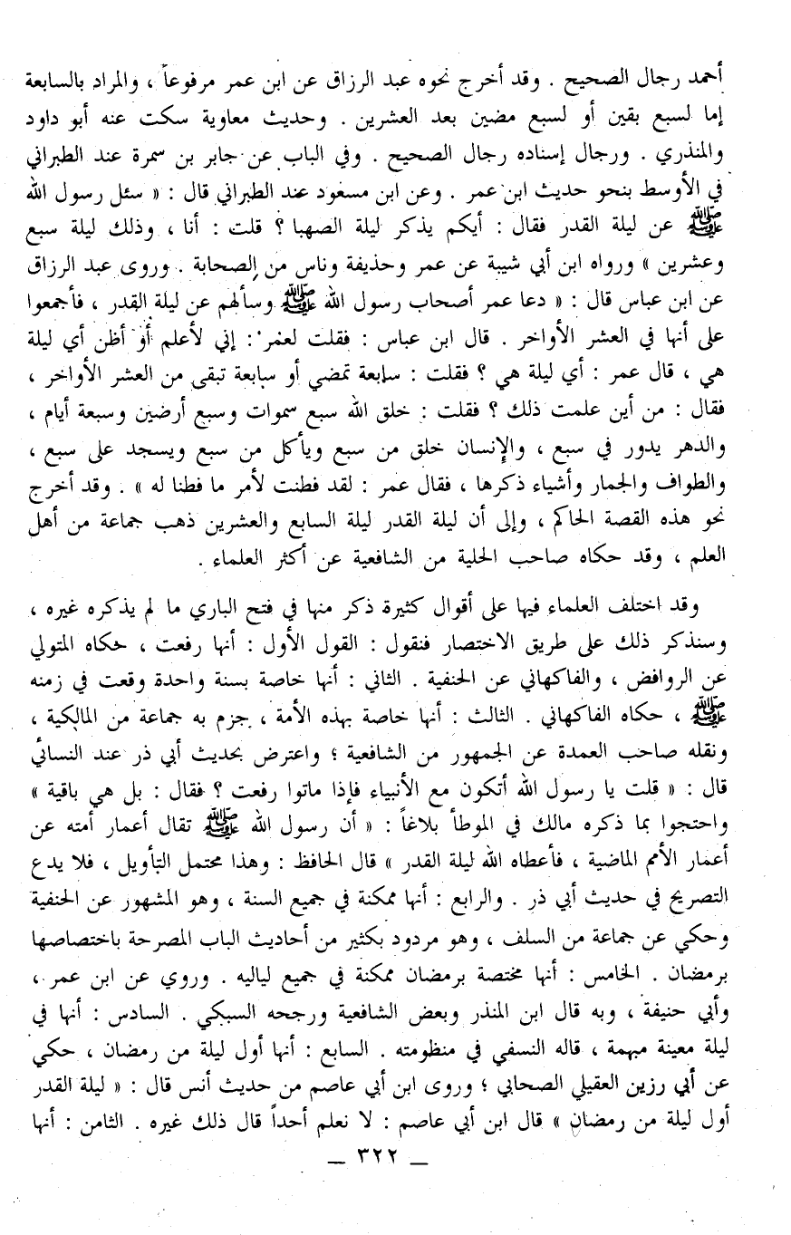 وَإِلَى أَنَّ لَيْلَةَ الْقَدْرِ لَيْلَةُ السَّابِعِ وَالْعِشْرِينَ ذَهَبَ جَمَاعَةٌ مِنْ أَهْلِ الْعِلْمِ، وَقَدْ حَكَاهُ صَاحِبُ الْحِلْيَةِ مِنْ الشَّافِعِيَّةِ عَنْ أَكْثَرِ الْعُلَمَاءِ. وَقَدْ اخْتَلَفَ الْعُلَمَاءُ فِيهَا عَلَى أَقْوَالٍ كَثِيرَةٍ ذُكِرَ مِنْهَا فِي فَتْحِ الْبَارِي مَا لَمْ يَذْكُرْهُ غَيْرُهُ، وَسَنَذْكُرُ ذَلِكَ عَلَى طَرِيقِ الِاخْتِصَارِ فَنَقُولُ: الْقَوْلُ الْأَوَّلُ: أَنَّهَا رُفِعَتْ، حَكَاهُ الْمُتَوَلِّي عَنْ الرَّوَافِضِ، وَالْفَاكِهَانِيُّ عَنْ الْحَنَفِيَّةِ