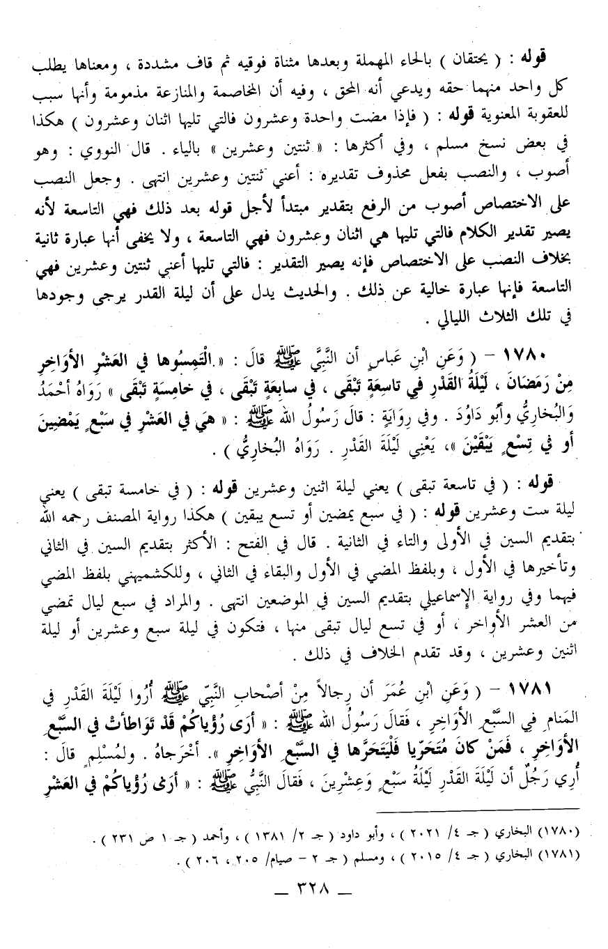 1781 - (وَعَنْ ابْنِ عُمَرَ «أَنَّ رِجَالًا مِنْ أَصْحَابِ النَّبِيِّ - صَلَّى اللَّهُ عَلَيْهِ وَسَلَّمَ - أُرُوا لَيْلَةَ الْقَدْرِ فِي الْمَنَامِ فِي السَّبْعِ الْأَوَاخِرِ، فَقَالَ رَسُولُ اللَّهِ - صَلَّى اللَّهُ عَلَيْهِ وَسَلَّمَ -: أَرَى رُؤْيَاكُمْ قَدْ تَوَاطَأَتْ فِي السَّبْعِ الْأَوَاخِرِ، فَمَنْ كَانَ مُتَحَرِّيًا فَلْيَتَحَرَّهَا فِي السَّبْعِ الْأَوَاخِرِ.» أَخْرَجَاهُ وَلِمُسْلِمٍ قَالَ: «أُرِيَ رَجُلٌ أَنَّ لَيْلَةَ الْقَدْرِ لَيْلَةَ سَبْعٍ وَعِشْرِينَ، فَقَالَ النَّبِيُّ - صَلَّى اللَّهُ عَلَيْهِ وَسَلَّمَ -: أَرَى رُؤْيَاكُمْ فِي الْعَشْرِ
