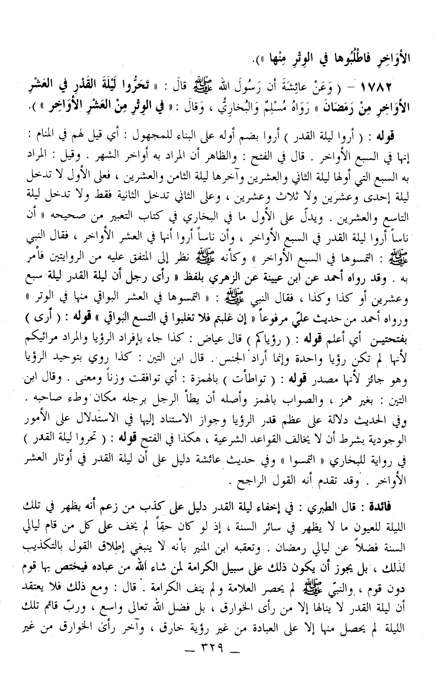 1782 - (وَعَنْ عَائِشَةَ أَنَّ رَسُولَ اللَّهِ - صَلَّى اللَّهُ عَلَيْهِ وَسَلَّمَ - قَالَ: «تَحَرَّوْا لَيْلَةَ الْقَدْرِ فِي الْعَشْرِ الْأَوَاخِرِ مِنْ رَمَضَانَ» رَوَاهُ مُسْلِمٌ وَالْبُخَارِيُّ، وَقَالَ: «فِي الْوِتْرِ مِنْ الْعَشْرِ الْأَوَاخِرِ» ) . قَوْلُهُ: (أُرُوا لَيْلَةَ الْقَدْرِ) أُرُوا بِضَمِّ أَوَّلِهِ عَلَى الْبِنَاءِ لِلْمَجْهُولِ: أَيْ قِيلَ لَهُمْ فِي الْمَنَامِ: إنَّهَا فِي السَّبْعِ الْأَوَاخِرِ. قَالَ فِي الْفَتْحِ: وَالظَّاهِرُ أَنَّ الْمُرَادَ بِهِ أَوَاخِرُ الشَّهْرِ. وَقِيلَ: الْمُرَادُ بِهِ السَّبْعُ الَّتِي أَوَّلُهَا لَيْلَةُ الثَّانِي وَالْعِشْرِينَ وَآخِرُهَا لَيْلَةُ الثَّامِنِ وَالْعِشْرِينَ، فَعَلَى الْأَوَّلِ لَا تَدْخُلُ لَهُ إحْدَى وَعِشْرِينَ وَلَا ثَلَاثٍ وَعِشْرِينَ، وَعَلَى الثَّانِي تَدْخُلُ الثَّانِيَةُ فَقَطْ وَلَا تَدْخُلُ لَيْلَةُ التَّاسِعِ وَالْعِشْرِينَ