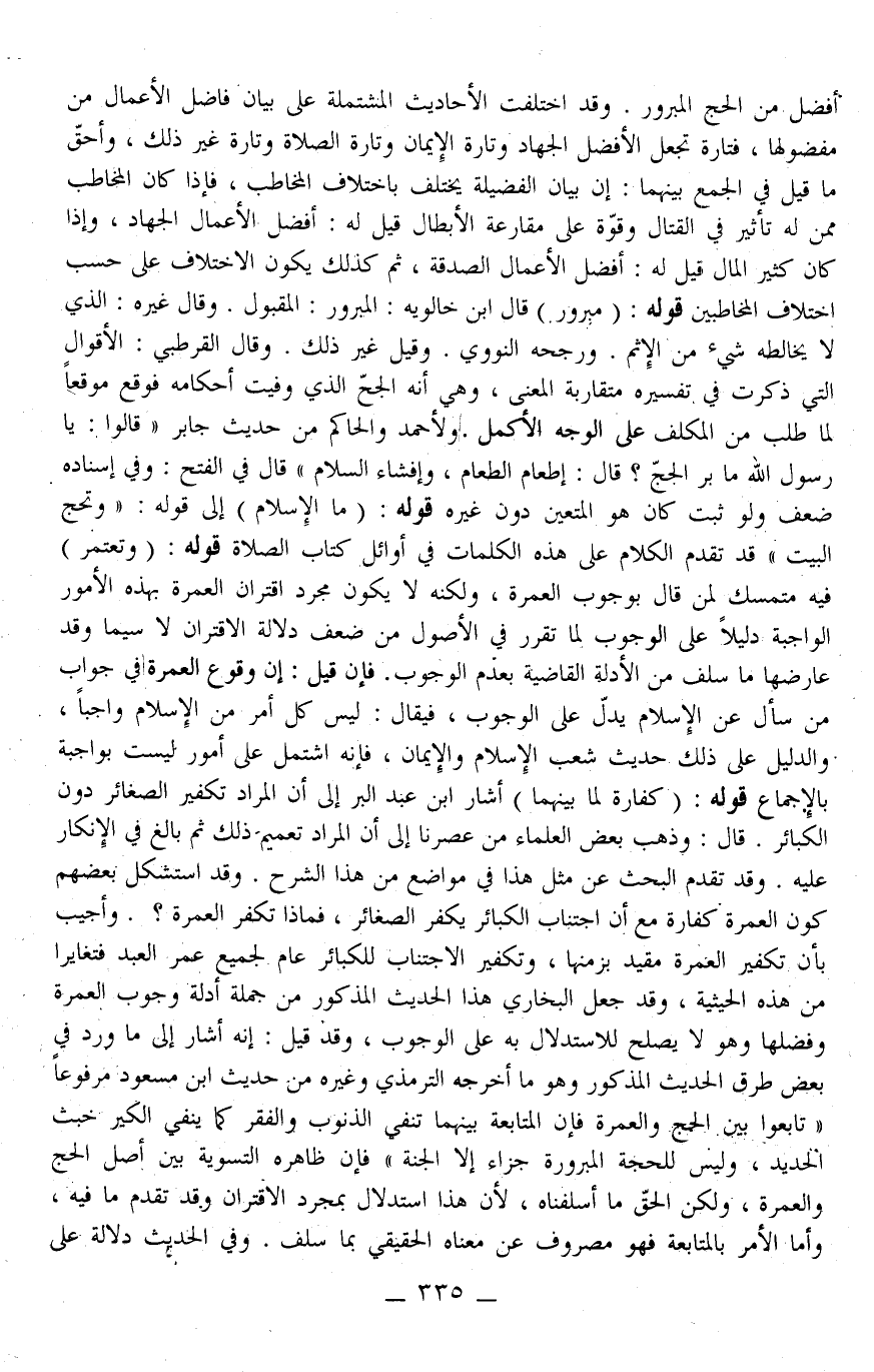 لَا سِيَّمَا وَقَدْ عَارَضَهَا مَا سَلَفَ مِنْ الْأَدِلَّةِ الْقَاضِيَةِ بِعَدَمِ الْوُجُوبِ. فَإِنْ قِيلَ: إنَّ وُقُوعَ الْعُمْرَةِ فِي جَوَابِ مَنْ سَأَلَ عَنْ الْإِسْلَامِ يَدُلُّ عَلَى الْوُجُوبِ، فَيُقَالُ: لَيْسَ كُلُّ أَمْرٍ مِنْ الْإِسْلَامِ وَاجِبًا، وَالدَّلِيلُ عَلَى ذَلِكَ حَدِيثُ شُعَبِ الْإِسْلَامِ وَالْإِيمَانِ، فَإِنَّهُ اشْتَمَلَ عَلَى أُمُورٍ لَيْسَتْ بِوَاجِبَةٍ بِالْإِجْمَاعِ قَوْلُهُ: (كَفَّارَةٌ لِمَا بَيْنَهُمَا) أَشَارَ ابْنُ عَبْدِ الْبَرِّ إلَى أَنَّ الْمُرَادَ تَكْفِيرُ الصَّغَائِرِ دُونَ الْكَبَائِرِ. قَالَ: وَذَهَبَ بَعْضُ الْعُلَمَاءِ مِنْ عَصْرِنَا إلَى أَنَّ الْمُرَادَ تَعْمِيمُ ذَلِكَ ثُمَّ بَالَغَ فِي الْإِنْكَارِ عَلَيْهِ. وَقَدْ تَقَدَّمَ الْبَحْثُ عَنْ مِثْلِ هَذَا فِي مَوَاضِعِ مِنْ هَذَا الشَّرْحِ. وَقَدْ اسْتَشْكَلَ بَعْضُهُمْ كَوْنَ الْعُمْرَةِ كَفَّارَةً مَعَ أَنَّ اجْتِنَابَ الْكَبَائِرِ يُكَفِّرُ الصَّغَائِرَ، فَمَاذَا تُكَفِّرُ الْعُمْرَةُ؟ وَأُجِيبَ بِأَنَّ تَكْفِيرَ الْعُمْرَةِ مُقَيَّدٌ بِزَمَنِهَا، وَتَكْفِيرُ الِاجْتِنَابِ لِلْكَبَائِرِ عَامٌّ لِجَمِيعِ عُمْرِ الْعَبْدِ فَتَغَايَرَا مِنْ هَذِهِ الْحَيْثِيَّةِ، وَقَدْ جَعَلَ الْبُخَارِيُّ هَذَا الْحَدِيثَ الْمَذْكُورَ مِنْ جُمْلَةِ أَدِلَّةِ وُجُوبِ الْعُمْرَةِ وَفَضْلِهَا وَهُوَ لَا يَصْلُحُ لِلِاسْتِدْلَالِ بِهِ عَلَى الْوُجُوبِ، وَقَدْ قِيلَ: إنَّهُ أَشَارَ إلَى مَا وَرَدَ فِي بَعْضِ طُرُقِ الْحَدِيثِ الْمَذْكُورِ وَهُوَ مَا أَخْرَجَهُ التِّرْمِذِيُّ وَغَيْرُهُ مِنْ حَدِيثِ ابْنِ مَسْعُودٍ مَرْفُوعًا «تَابِعُوا بَيْنَ الْحَجِّ وَالْعُمْرَةِ فَإِنَّ الْمُتَابَعَةَ بَيْنَهُمَا تَنْفِي الذُّنُوبَ وَالْفَقْرَ كَمَا يَنْفِي الْكِيرُ خَبَثَ الْحَدِيدِ، وَلَيْسَ لِلْحَجَّةِ الْمَبْرُورَةِ جَزَاءٌ إلَّا الْجَنَّةَ» فَإِنَّ ظَاهِرَهُ التَّسْوِيَةُ بَيْنَ أَصْلِ الْحَجِّ وَالْعُمْرَةِ، وَلَكِنَّ الْحَقَّ مَا أَسْلَفْنَاهُ، لِأَنَّ هَذَا اسْتِدْلَالٌ بِمُجَرَّدِ الِاقْتِرَانِ وَقَدْ تَقَدَّمَ مَا فِيهِ، وَأَمَّا الْأَمْرُ بِالْمُتَابَعَةِ فَهُوَ مَصْرُوفٌ عَنْ مَعْنَاهُ الْحَقِيقِيِّ بِمَا سَلَفَ.