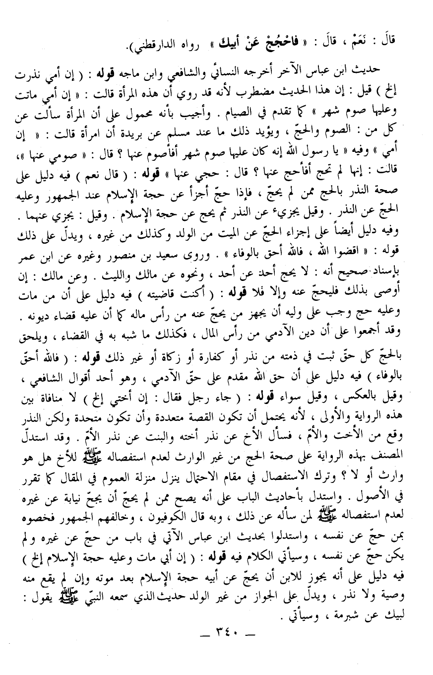 قَالَ: نَعَمْ، قَالَ: فَاحْجُجْ عَنْ أَبِيكَ» رَوَاهُ الدَّارَقُطْنِيّ)