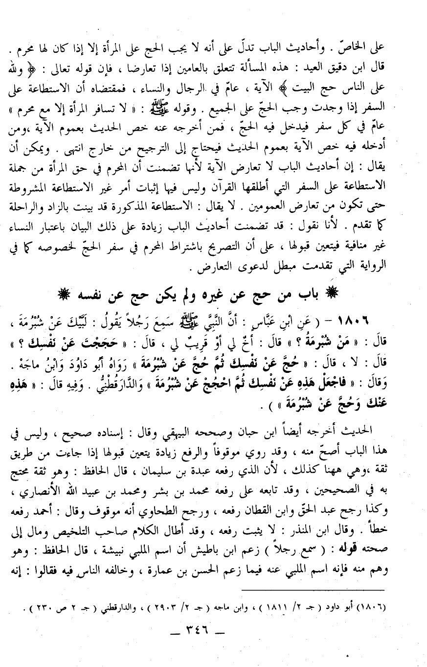 1806 - (عَنْ ابْنِ عَبَّاسٍ: «أَنَّ النَّبِيَّ - صَلَّى اللَّهُ عَلَيْهِ وَسَلَّمَ - سَمِعَ رَجُلًا يَقُولُ: لَبَّيْكَ عَنْ شُبْرُمَةَ، قَالَ: مَنْ شُبْرُمَةُ؟ قَالَ: أَخٌ لِي أَوْ قَرِيبٌ لِي، قَالَ: حَجَجْتَ عَنْ نَفْسِكَ؟ قَالَ: لَا، قَالَ: حُجَّ عَنْ نَفْسِكَ ثُمَّ حُجَّ عَنْ شُبْرُمَةَ» رَوَاهُ أَبُو دَاوُد وَابْنُ مَاجَهْ. وَقَالَ: " فَاجْعَلْ هَذِهِ عَنْ نَفْسِكَ ثُمَّ اُحْجُجْ عَنْ شُبْرُمَةَ " وَالدَّارَقُطْنِيّ.