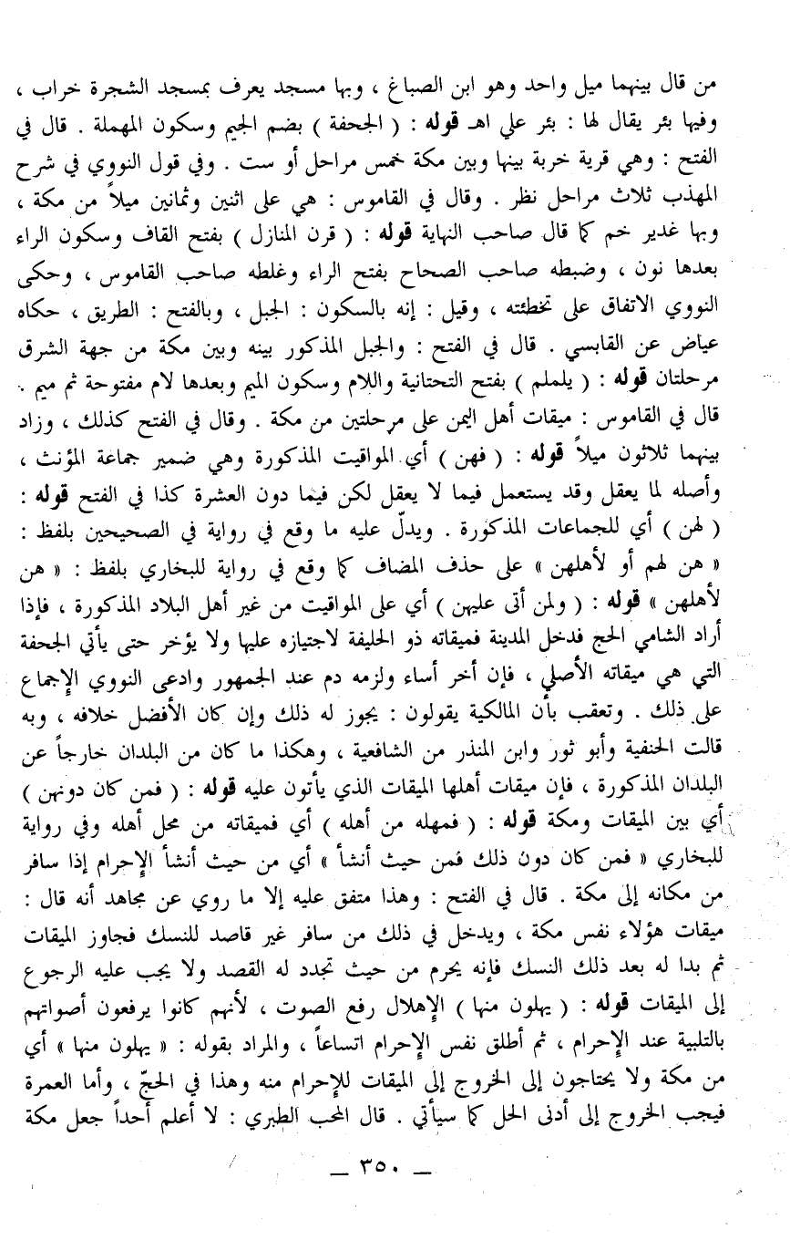 (قَرْنُ الْمَنَازِلِ) بِفَتْحِ الْقَافِ وَسُكُونِ الرَّاءِ بَعْدَهَا نُونٌ، وَضَبَطَهُ صَاحِبُ الصِّحَاحِ بِفَتْحِ الرَّاءِ وَغَلَّطَهُ صَاحِبُ الْقَامُوسِ، وَحَكَى النَّوَوِيُّ الِاتِّفَاقَ عَلَى تَخْطِئَتِهِ، وَقِيلَ: إنَّهُ بِالسُّكُونِ: الْجَبَلُ، وَبِالْفَتْحِ: الطَّرِيقُ، حَكَاهُ عِيَاضٌ عَنْ الْقَابِسِيِّ. قَالَ فِي الْفَتْحِ: وَالْجَبَلُ الْمَذْكُورُ بَيْنَهُ وَبَيْنَ مَكَّةَ مِنْ جِهَةِ الشَّرْقِ مَرْحَلَتَانِ قَوْلُهُ: (يَلَمْلَمُ) بِفَتْحِ التَّحْتَانِيَّةِ وَاللَّامِ وَسُكُونِ الْمِيمِ وَبَعْدَهَا لَامٌ مَفْتُوحَةٌ ثُمَّ مِيمٌ. قَالَ فِي الْقَامُوسِ: مِيقَاتُ أَهْلِ الْيَمَنِ عَلَى مَرْحَلَتَيْنِ مِنْ مَكَّةَ. وَقَالَ فِي الْفَتْحِ كَذَلِكَ، وَزَادَ بَيْنَهُمَا ثَلَاثُونَ مِيلًا قَوْلُهُ: (فَهُنَّ) أَيْ: - الْمَوَاقِيتُ الْمَذْكُورَةُ وَهِيَ ضَمِيرُ جَمَاعَةِ الْمُؤَنَّثِ، وَأَصْلُهُ لِمَا يَعْقِلُ وَقَدْ يُسْتَعْمَلُ فِيمَا لَا يَعْقِلُ لَكِنْ فِيمَا دُونَ الْعَشَرَةِ كَذَا فِي الْفَتْحِ قَوْلُهُ: (لَهُنَّ) أَيْ لِلْجَمَاعَاتِ الْمَذْكُورَةِ. وَيَدُلُّ عَلَيْهِ مَا وَقَعَ فِي رِوَايَةٍ فِي الصَّحِيحَيْنِ بِلَفْظِ: " هُنَّ لَهُمْ أَوْ لِأَهْلِهِنَّ " عَلَى حَذْفِ الْمُضَافِ كَمَا وَقَعَ فِي رِوَايَةٍ لِلْبُخَارِيِّ بِلَفْظِ: " هُنَّ لِأَهْلِهِنَّ " قَوْلُهُ: (وَلِمَنْ أَتَى عَلَيْهِنَّ) أَيْ عَلَى الْمَوَاقِيتِ مِنْ غَيْرِ أَهْلِ الْبِلَادِ الْمَذْكُورَةِ، فَإِذَا أَرَادَ الشَّامِيُّ الْحَجَّ فَدَخَلَ الْمَدِينَةَ فَمِيقَاتُهُ ذُو الْحُلَيْفَةِ لِاجْتِيَازِهِ عَلَيْهَا وَلَا يُؤَخِّرُ حَتَّى يَأْتِيَ الْجُحْفَةَ الَّتِي هِيَ مِيقَاتُهُ الْأَصْلِيُّ، فَإِنْ أَخَّرَ أَسَاءَ وَلَزِمَهُ دَمٌ عِنْدَ الْجُمْهُورِ وَادَّعَى النَّوَوِيُّ الْإِجْمَاعَ عَلَى ذَلِكَ