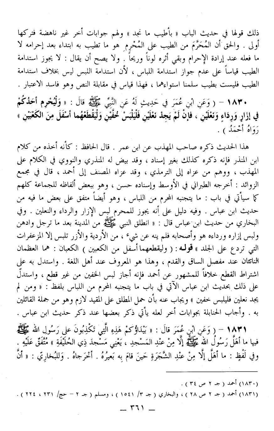 1830 - (وَعَنْ ابْنِ عُمَرَ فِي حَدِيثٍ لَهُ عَنْ النَّبِيِّ - صَلَّى اللَّهُ عَلَيْهِ وَسَلَّمَ - قَالَ: «وَلْيُحْرِمْ أَحَدُكُمْ فِي إزَارٍ وَرِدَاءٍ وَنَعْلَيْنِ، فَإِنْ لَمْ يَجِدْ نَعْلَيْنِ فَلْيَلْبَسْ خُفَّيْنِ وَلْيَقْطَعْهُمَا أَسْفَلَ مِنْ الْكَعْبَيْنِ» رَوَاهُ أَحْمَدُ) . .
