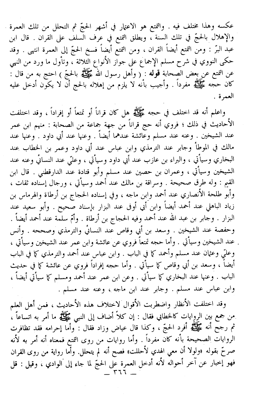 وَأَمَّا حَجُّهُ إفْرَادًا فَرُوِيَ عَنْ عَائِشَةَ كَمَا فِي حَدِيثِ الْبَابِ. وَعَنْهَا عِنْدَ الْبُخَارِيِّ كَمَا سَيَأْتِي. وَعَنْ ابْنِ عُمَرَ عِنْدَ أَحْمَدَ وَمُسْلِمٍ كَمَا سَيَأْتِي أَيْضًا وَابْنُ عَبَّاسٍ عِنْدَ مُسْلِمٍ. وَجَابِرٌ عِنْدَ ابْنِ مَاجَهْ، وَعَنْهُ عِنْدَ مُسْلِمٍ. وَقَدْ اخْتَلَفَتْ الْأَنْظَارُ وَاضْطَرَبَتْ الْأَقْوَالُ لِاخْتِلَافِ هَذِهِ الْأَحَادِيثِ، فَمِنْ أَهْلِ الْعِلْمِ مَنْ جَمَعَ بَيْنَ الرِّوَايَاتِ كَالْخَطَّابِيِّ فَقَالَ: إنَّ كُلًّا أَضَافَ إلَى النَّبِيِّ - صَلَّى اللَّهُ عَلَيْهِ وَسَلَّمَ - مَا أَمَرَ بِهِ اتِّسَاعًا، ثُمَّ رَجَّحَ أَنَّهُ - صَلَّى اللَّهُ عَلَيْهِ وَسَلَّمَ - أَفْرَدَ الْحَجَّ، وَكَذَا قَالَ عِيَاضٌ وَزَادَ فَقَالَ: وَأَمَّا إحْرَامُهُ فَقَدْ تَظَافَرَتْ الرِّوَايَاتُ الصَّحِيحَةُ بِأَنَّهُ كَانَ مُفْرَدًا. وَأَمَّا رِوَايَاتُ مَنْ رَوَى التَّمَتُّعَ فَمَعْنَاهُ أَنَّهُ أَمَرَ بِهِ لِأَنَّهُ صَرَّحَ بِقَوْلِهِ " وَلَوْلَا أَنَّ مَعِي الْهَدْيَ لَأَحْلَلْتُ " فَصَحَّ أَنَّهُ لَمْ يَتَحَلَّلْ. وَأَمَّا رِوَايَةُ مَنْ رَوَى الْقِرَانَ فَهُوَ إخْبَارٌ عَنْ آخِرِ أَحْوَالِهِ لِأَنَّهُ أَدْخَلَ الْعُمْرَةَ عَلَى الْحَجِّ لَمَّا جَاءَ إلَى الْوَادِي، وَقِيلَ: قُلْ
