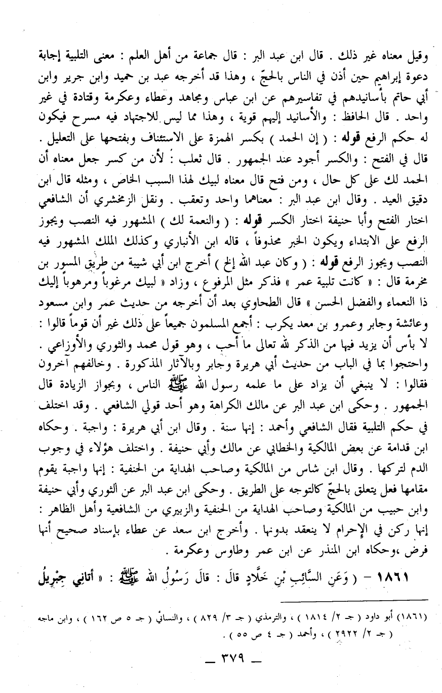 1861 - (وَعَنْ السَّائِبِ بْنِ خَلَّادٍ قَالَ: قَالَ رَسُولُ اللَّهِ - صَلَّى اللَّهُ عَلَيْهِ وَسَلَّمَ -: «أَتَانِي جِبْرِيلُ فَأَمَرَنِي أَنْ آمُرَ أَصْحَابِي أَنْ يَرْفَعُوا أَصْوَاتَهُمْ بِالْإِهْلَالِ وَالتَّلْبِيَةِ» رَوَاهُ الْخَمْسَةُ وَصَحَّحَهُ التِّرْمِذِيُّ.