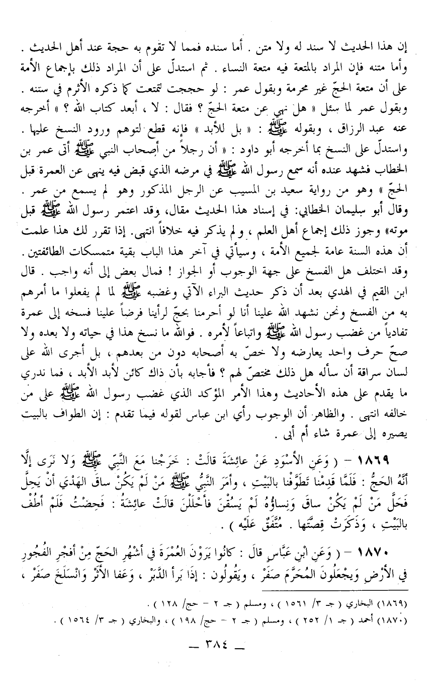 ـــــــــــــــــــــــــــــQإنَّ هَذَا الْحَدِيثَ لَا سَنَدَ لَهُ وَلَا مَتْنَ. أَمَّا سَنَدُهُ فَمِمَّا لَا تَقُومُ بِهِ حُجَّةٌ عِنْدَ أَهْلِ الْحَدِيثِ. وَأَمَّا مَتْنُهُ فَإِنَّ الْمُرَادَ بِالْمُتْعَةِ فِيهِ مُتْعَةُ النِّسَاءِ. ثُمَّ اسْتَدَلَّ عَلَى أَنَّ الْمُرَادَ ذَلِكَ بِإِجْمَاعِ الْأُمَّةِ عَلَى أَنَّ مُتْعَةَ الْحَجِّ غَيْرُ مُحَرَّمَةٍ وَبِقَوْلِ عُمَرَ: لَوْ حَجَجْتُ لَتَمَتَّعْتُ كَمَا ذَكَرَهُ الْأَثْرَمُ فِي سُنَنِهِ. وَبِقَوْلِ عُمَرَ لَمَّا سُئِلَ " هَلْ نَهَى عَنْ مُتْعَةِ الْحَجِّ؟ فَقَالَ: لَا، أَبَعْدَ كِتَابِ اللَّهِ؟ " أَخْرَجَهُ عَنْهُ عَبْدُ الرَّزَّاقِ، وَبِقَوْلِهِ - صَلَّى اللَّهُ عَلَيْهِ وَسَلَّمَ -: " بَلْ لِلْأَبَدِ " فَإِنَّهُ قَطْعٌ لِتَوَهُّمِ وُرُودِ النَّسْخِ عَلَيْهَا. وَاسْتَدَلَّ عَلَى النَّسْخِ بِمَا أَخْرَجَهُ أَبُو دَاوُد: «أَنَّ رَجُلًا مِنْ أَصْحَابِ النَّبِيِّ - صَلَّى اللَّهُ عَلَيْهِ وَسَلَّمَ - أَتَى عُمَرَ بْنَ الْخَطَّابِ فَشَهِدَ عِنْدَهُ أَنَّهُ سَمِعَ رَسُولَ اللَّهِ - صَلَّى اللَّهُ عَلَيْهِ وَسَلَّمَ - فِي مَرَضِهِ الَّذِي قُبِضَ فِيهِ يَنْهَى عَنْ الْعُمْرَةِ قَبْلَ الْحَجِّ» وَهُوَ مِنْ رِوَايَةِ سَعِيدِ بْنِ الْمُسَيِّبِ عَنْ الرَّجُلِ الْمَذْكُورِ وَهُوَ لَمْ يَسْمَعْ مِنْ عُمَرَ وَقَالَ أَبُو سُلَيْمَانَ الْخَطَّابِيِّ: فِي إسْنَادِ هَذَا الْحَدِيثِ مَقَالٌ، وَقَدْ اعْتَمَرَ رَسُولُ اللَّهِ - صَلَّى اللَّهُ عَلَيْهِ وَسَلَّمَ - قَبْلَ مَوْتِهِ "