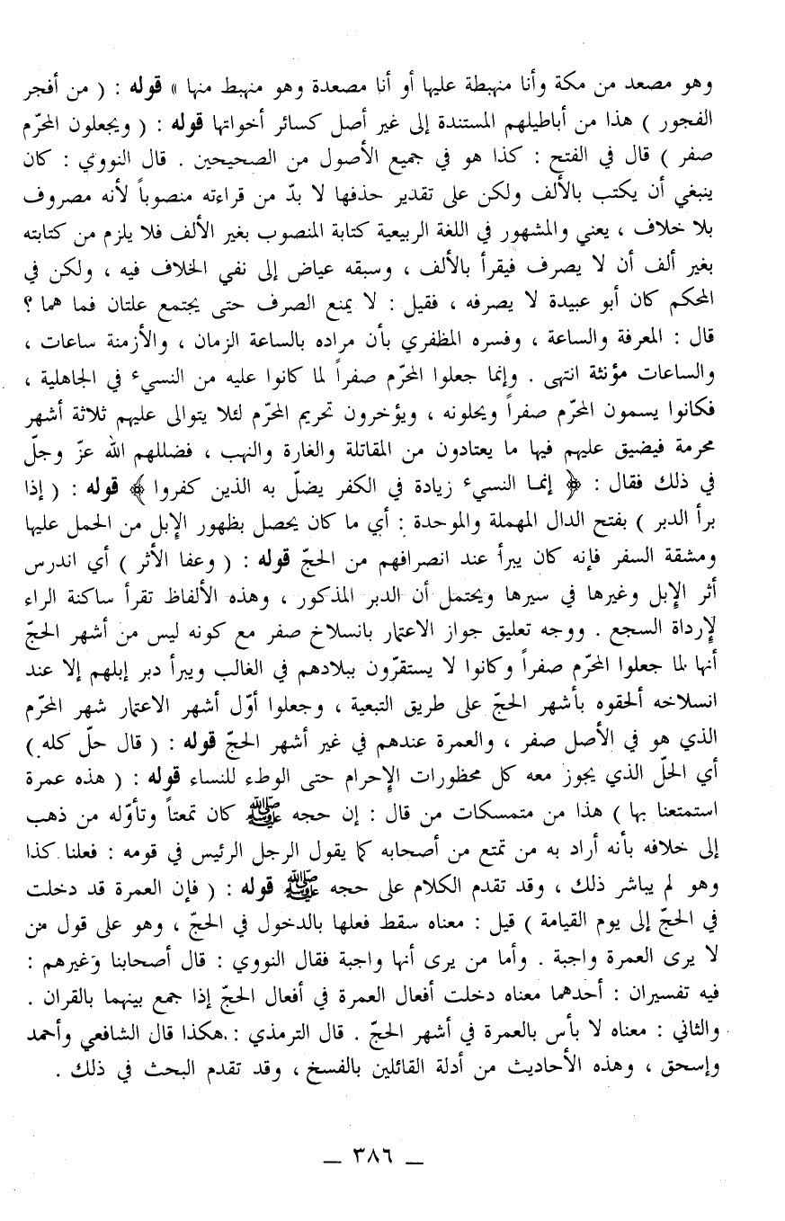 قَوْلَهُ: (مِنْ أَفْجَرِ الْفُجُورِ) هَذَا مِنْ أَبَاطِيلِهِمْ الْمُسْتَنِدَةِ إلَى غَيْرِ أَصْلٍ كَسَائِرِ أَخَوَاتِهَا. قَوْلُهُ: (وَيَجْعَلُونَ الْمُحَرَّمَ صَفَرَ) قَالَ فِي الْفَتْحِ: كَذَا هُوَ فِي جَمِيعِ الْأُصُولِ مِنْ الصَّحِيحَيْنِ. قَالَ النَّوَوِيُّ: كَانَ يَنْبَغِي أَنْ يُكْتَبَ بِالْأَلِفِ وَلَكِنْ عَلَى تَقْدِيرِ حَذْفِهَا لَا بُدَّ مِنْ قِرَاءَتِهِ مَنْصُوبًا لِأَنَّهُ مَصْرُوفٌ بِلَا خِلَافٍ، يَعْنِي وَالْمَشْهُورُ فِي اللُّغَةِ الرَّبِيعِيَّةِ كِتَابَةُ الْمَنْصُوبِ بِغَيْرِ الْأَلْفِ فَلَا يَلْزَمُ مِنْ كِتَابَتِهِ بِغَيْرِ أَلِفٍ أَنْ لَا يُصْرَفَ فَيُقْرَأُ بِالْأَلِفِ، وَسَبَقَهُ عِيَاضٌ إلَى نَفْيِ الْخِلَافِ فِيهِ، وَلَكِنْ فِي الْمُحْكَمِ كَانَ أَبُو عُبَيْدَةَ لَا يَصْرِفُهُ، فَقِيلَ: لَا يُمْنَعُ الصَّرْفُ حَتَّى يَجْتَمِعَ عِلَّتَانِ فَمَا هُمَا؟ قَالَ: الْمَعْرِفَةُ وَالسَّاعَةُ، وَفَسَّرَهُ الْمُظَفِّرِيُّ بِأَنَّ مُرَادَهُ بِالسَّاعَةِ الزَّمَانُ، وَالْأَزْمِنَةُ سَاعَاتٌ، وَالسَّاعَاتُ مُؤَنَّثَةٌ انْتَهَى. وَإِنَّمَا جَعَلُوا الْمُحَرَّمَ صَفَرًا لِمَا كَانُوا عَلَيْهِ مِنْ النَّسِيءِ فِي الْجَاهِلِيَّةِ، فَكَانُوا يُسَمُّونَ الْمُحَرَّمَ صَفَرًا وَيُحِلُّونَهُ، وَيُؤَخِّرُونَ تَحْرِيمَ الْمُحَرَّمِ لِئَلَّا يَتَوَالَى عَلَيْهِمْ ثَلَاثَةُ أَشْهُرٍ مُحَرَّمَةٍ فَيُضَيَّقُ عَلَيْهِمْ فِيهَا مَا يَعْتَادُونَ مِنْ الْمُقَاتَلَةِ وَالْغَارَةِ وَالنَّهْبِ، فَضَلَّلَهُمْ اللَّهُ عَزَّ وَجَلَّ فِي ذَلِكَ فَقَالَ: {إِنَّمَا النَّسِيءُ زِيَادَةٌ فِي الْكُفْرِ يُضَلُّ بِهِ الَّذِينَ كَفَرُوا} [التوبة: 37] قَوْلُهُ: (إذَا بَرَأَ الدَّبَرُ) بِفَتْحِ الدَّالِ الْمُهْمَلَةِ وَالْمُوَحَّدَةِ: أَيْ مَا كَانَ يَحْصُلُ بِظُهُورِ الْإِبِلِ مِنْ الْحَمْلِ عَلَيْهَا وَمَشَقَّةِ السَّفَرِ فَإِنَّهُ كَانَ يَبْرَأُ عِنْدَ انْصِرَافِهِمْ مِنْ الْحَجِّ.