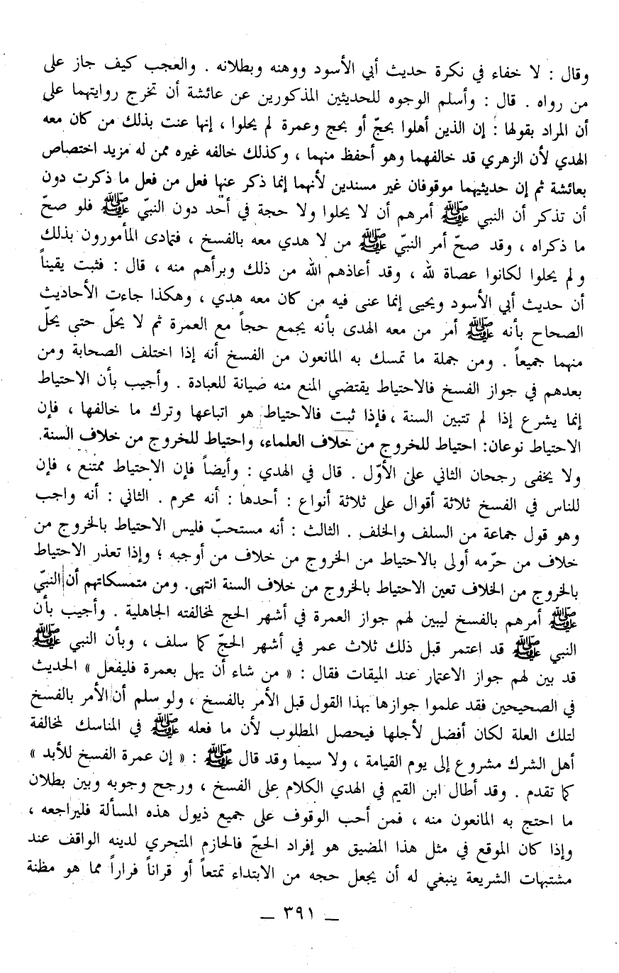 وَمِنْ جُمْلَةِ مَا تَمَسَّكَ بِهِ الْمَانِعُونَ مِنْ الْفَسْخِ أَنَّهُ إذَا اخْتَلَفَ الصَّحَابَةُ وَمَنْ بَعْدَهُمْ فِي جَوَازِ الْفَسْخِ فَالِاحْتِيَاطُ يَقْتَضِي الْمَنْعَ مِنْهُ صِيَانَةً لِلْعِبَادَةِ. وَأُجِيبَ بِأَنَّ الِاحْتِيَاطَ إنَّمَا يُشْرَعُ إذَا لَمْ تَتَبَيَّنْ السُّنَّةُ، فَإِذَا ثَبَتَ فَالِاحْتِيَاطُ هُوَ اتِّبَاعُهَا وَتَرْكُ مَا خَالَفَهَا، فَإِنَّ الِاحْتِيَاطَ نَوْعَانِ: احْتِيَاطٌ لِلْخُرُوجِ مِنْ خِلَافِ الْعُلَمَاءِ، وَاحْتِيَاطٌ لِلْخُرُوجِ مِنْ خِلَافِ السُّنَّةِ. وَلَا يَخْفَى رُجْحَانُ الثَّانِي عَلَى الْأَوَّلِ. قَالَ فِي الْهَدْيِ: وَأَيْضًا فَإِنَّ الِاحْتِيَاطَ مُمْتَنِعٌ، فَإِنَّ لِلنَّاسِ فِي الْفَسْخِ ثَلَاثَةَ أَقْوَالٍ عَلَى ثَلَاثَةِ أَنْوَاعٍ: أَحَدُهَا - أَنَّهُ مُحَرَّمٌ. الثَّانِي: أَنَّهُ وَاجِبٌ وَهُوَ قَوْلُ جَمَاعَةٍ مِنْ السَّلَفِ وَالْخَلَفِ. الثَّالِثُ: أَنَّهُ مُسْتَحَبٌّ فَلَيْسَ الِاحْتِيَاطُ بِالْخُرُوجِ مِنْ خِلَافِ مَنْ حَرَّمَهُ أَوْلَى بِالِاحْتِيَاطِ مِنْ الْخُرُوجِ مِنْ خِلَافِ مَنْ أَوْجَبَهُ؛ وَإِذَا تَعَذَّرَ الِاحْتِيَاطُ بِالْخُرُوجِ مِنْ الْخِلَافِ تَعَيَّنَ الِاحْتِيَاطُ بِالْخُرُوجِ مِنْ خِلَافِ السُّنَّةِ انْتَهَى. وَمِنْ مُتَمَسَّكَاتِهِمْ أَنَّ النَّبِيَّ - صَلَّى اللَّهُ عَلَيْهِ وَسَلَّمَ - أَمَرَهُمْ بِالْفَسْخِ لِيُبَيِّنَ لَهُمْ جَوَازَ الْعُمْرَةِ فِي أَشْهُرِ الْحَجِّ لِمُخَالَفَتِهِ الْجَاهِلِيَّةَ.