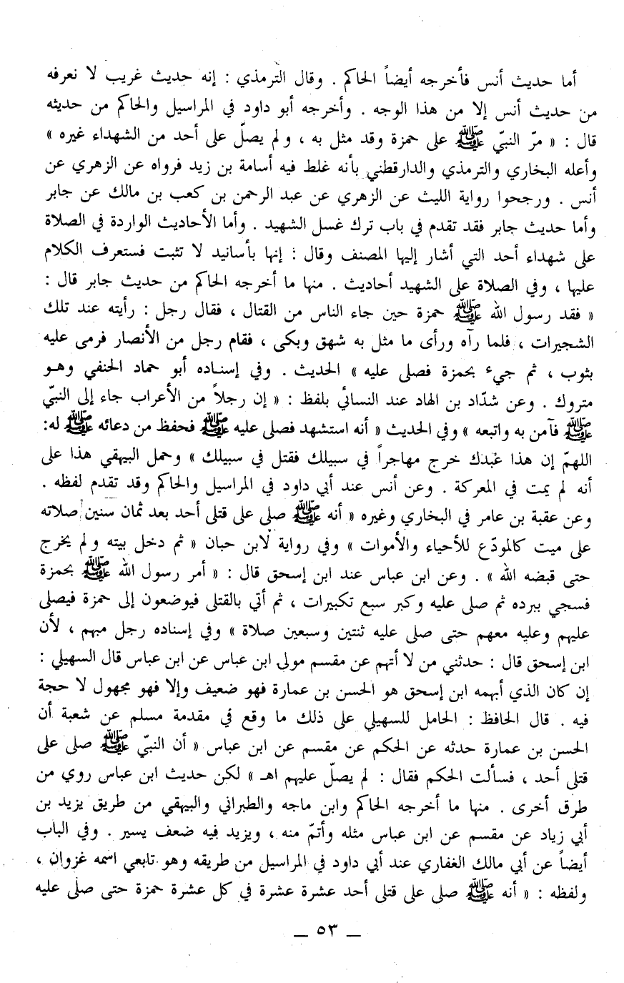 أَمَّا حَدِيثُ أَنَسٍ فَأَخْرَجَهُ أَيْضًا الْحَاكِمُ. وَقَالَ التِّرْمِذِيُّ: إنَّهُ حَدِيثٌ غَرِيبٌ لَا نَعْرِفُهُ مِنْ حَدِيثِ أَنَسٍ إلَّا مِنْ هَذَا الْوَجْهِ. وَأَخْرَجَهُ أَبُو دَاوُد فِي الْمَرَاسِيلِ وَالْحَاكِمُ مِنْ حَدِيثِهِ قَالَ: «مَرَّ النَّبِيُّ - صَلَّى اللَّهُ عَلَيْهِ وَسَلَّمَ - عَلَى حَمْزَةَ وَقَدْ مُثِّلَ بِهِ، وَلَمْ يُصَلِّ عَلَى أَحَدٍ مِنْ الشُّهَدَاءِ غَيْرِهِ» وَأَعَلَّهُ الْبُخَارِيُّ وَالتِّرْمِذِيُّ وَالدَّارَقُطْنِيّ بِأَنَّهُ غَلِطَ فِيهِ أُسَامَةُ بْنُ زَيْدٍ فَرَوَاهُ عَنْ الزُّهْرِيِّ عَنْ أَنَسٍ وَرَجَّحُوا رِوَايَةَ اللَّيْثِ عَنْ الزُّهْرِيِّ عَنْ عَبْدِ الرَّحْمَنِ بْنِ كَعْبِ بْنِ مَالِكٍ عَنْ جَابِرٍ وَأَمَّا حَدِيثُ جَابِرٍ فَقَدْ تَقَدَّمَ فِي بَابِ تَرْكِ غُسْلِ الشَّهِيدِ. وَأَمَّا الْأَحَادِيثُ الْوَارِدَةُ فِي الصَّلَاةِ عَلَى شُهَدَاءِ أُحُدٍ الَّتِي أَشَارَ إلَيْهَا الْمُصَنِّفُ وَقَالَ: إنَّهَا بِأَسَانِيدَ لَا تَثْبُت فَسَتَعْرِفُ الْكَلَامَ عَلَيْهَا، وَفِي الصَّلَاةِ عَلَى الشَّهِيدِ أَحَادِيثُ. مِنْهَا مَا أَخْرَجَهُ الْحَاكِمُ مِنْ حَدِيثِ جَابِرٍ قَالَ: «فَقَدَ رَسُولُ اللَّهِ - صَلَّى اللَّهُ عَلَيْهِ وَسَلَّمَ - حَمْزَةَ حِينَ جَاءَ النَّاسُ مِنْ الْقِتَالِ، فَقَالَ رَجُلٌ: رَأَيْتُهُ عِنْدَ تِلْكَ الشُّجَيْرَاتِ، فَلَمَّا رَآهُ وَرَأَى مَا مُثِّلَ بِهِ شَهِقَ وَبَكَى، فَقَامَ رَجُلٌ مِنْ الْأَنْصَارِ فَرَمَى عَلَيْهِ بِثَوْبٍ، ثُمَّ جِيءَ بِحَمْزَةَ فَصَلَّى عَلَيْهِ» الْحَدِيثَ. وَفِي إسْنَادِهِ أَبُو حَمَّادٍ الْحَنَفِيُّ وَهُوَ مَتْرُوكٌ