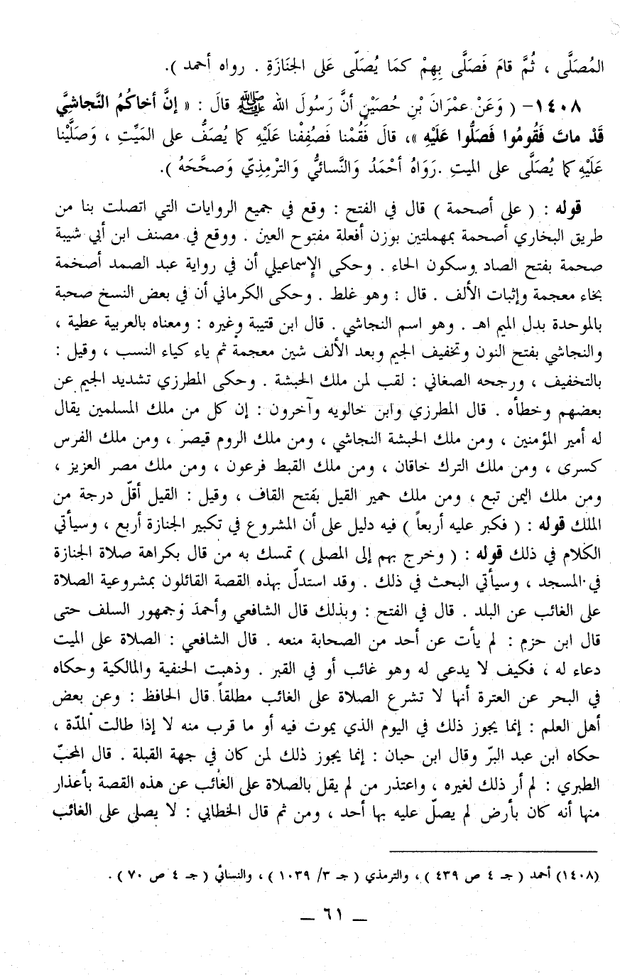 1408 - (وَعَنْ عِمْرَانَ بْنِ حُصَيْنٍ أَنَّ رَسُولَ اللَّهِ - صَلَّى اللَّهُ عَلَيْهِ وَسَلَّمَ - قَالَ: «إنَّ أَخَاكُمْ النَّجَاشِيَّ قَدْ مَاتَ فَقُومُوا فَصَلُّوا عَلَيْهِ، قَالَ فَقُمْنَا فَصَفَفْنَا عَلَيْهِ كَمَا يُصَفُّ عَلَى الْمَيِّتِ، وَصَلَّيْنَا عَلَيْهِ كَمَا يُصَلَّى عَلَى الْمَيِّتِ» . رَوَاهُ أَحْمَدُ وَالنَّسَائِيُّ وَالتِّرْمِذِيُّ وَصَحَّحَهُ) .