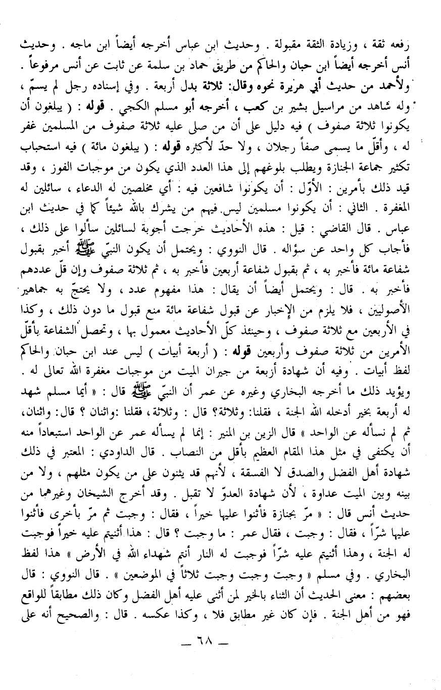 قَالَ الْقَاضِي: قِيلَ: هَذِهِ الْأَحَادِيثُ خَرَجَتْ أَجْوِبَةً لِسَائِلِينَ سَأَلُوا عَلَى ذَلِكَ، فَأَجَابَ كُلُّ وَاحِدٍ عَنْ سُؤَالِهِ. قَالَ النَّوَوِيُّ: وَيُحْتَمَلُ أَنْ يَكُونَ النَّبِيُّ - صَلَّى اللَّهُ عَلَيْهِ وَسَلَّمَ - أَخْبَرَ بِقَبُولِ شَفَاعَةِ مِائَةٍ فَأَخْبَرَ بِهِ، ثُمَّ بِقَبُولِ شَفَاعَةِ أَرْبَعِينَ فَأَخْبَرَ بِهِ، ثُمَّ ثَلَاثَةُ صُفُوفٍ وَإِنْ قَلَّ عَدَدُهُمْ فَأَخْبَرَ بِهِ. قَالَ: وَيُحْتَمَلُ أَيْضًا أَنْ يُقَالَ: هَذَا مَفْهُومُ عَدَدٍ، وَلَا يَحْتَجُّ بِهِ جَمَاهِيرُ الْأُصُولِيِّينَ، فَلَا يَلْزَمُ مِنْ الْأَخْبَارِ عَنْ قَبُولِ شَفَاعَةِ مِائَةٍ مَنْعُ قَبُولِ مَا دُونَ ذَلِكَ، وَكَذَا فِي الْأَرْبَعِينَ ثَلَاثَةُ صُفُوفٍ، وَحِينَئِذٍ كُلُّ الْأَحَادِيثِ مَعْمُولٌ بِهَا، وَتَحْصُلُ الشَّفَاعَةُ بِأَقَلِّ الْأَمْرَيْنِ مِنْ ثَلَاثَةِ صُفُوفٍ وَأَرْبَعِينَ قَوْلُهُ: (أَرْبَعَةُ أَبْيَاتٍ) لَيْسَ عِنْدَ ابْنِ حِبَّانَ وَالْحَاكِمِ لَفْظُ أَبْيَاتٍ. وَفِيهِ أَنَّ شَهَادَةَ أَرْبَعَةٍ مِنْ جِيرَانِ الْمَيِّتِ مِنْ مُوجِبَاتِ مَغْفِرَةِ اللَّهِ تَعَالَى لَهُ