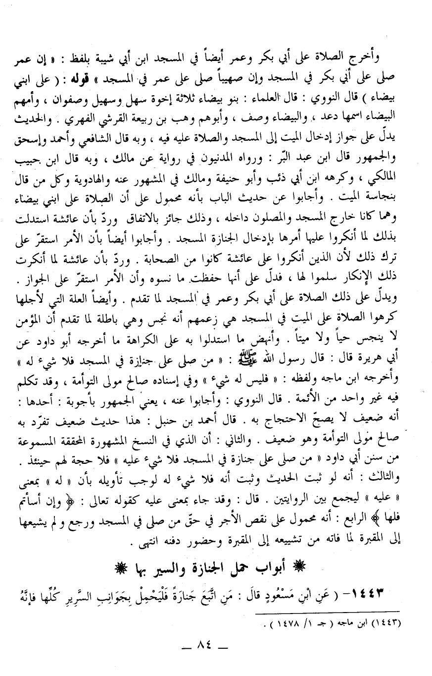 وَأَيْضًا الْعِلَّةُ الَّتِي لِأَجْلِهَا كَرِهُوا الصَّلَاةَ عَلَى الْمَيِّتِ فِي الْمَسْجِدِ هِيَ زَعْمُهُمْ أَنَّهُ نَجَسٌ وَهِيَ بَاطِلَةٌ لِمَا تَقَدَّمَ أَنَّ الْمُؤْمِنَ لَا يَنْجُسُ حَيًّا وَلَا مَيِّتًا. وَأَنْهَضُ مَا اسْتَدَلُّوا بِهِ عَلَى الْكَرَاهَةِ مَا أَخْرَجَهُ أَبُو دَاوُد عَنْ أَبِي هُرَيْرَةَ قَالَ: قَالَ رَسُولُ اللَّهِ - صَلَّى اللَّهُ عَلَيْهِ وَسَلَّمَ -: «مَنْ صَلَّى عَلَى جِنَازَةٍ فِي الْمَسْجِدِ فَلَا شَيْءَ لَهُ» وَأَخْرَجَهُ ابْنُ مَاجَهْ وَلَفْظُهُ: " فَلَيْسَ لَهُ شَيْءٌ " وَفِي إسْنَادِهِ صَالِحٌ مَوْلَى التَّوْأَمَةِ، وَقَدْ تَكَلَّمَ فِيهِ غَيْرُ وَاحِدٍ مِنْ الْأَئِمَّةِ. قَالَ النَّوَوِيُّ: وَأَجَابُوا عَنْهُ، يَعْنِي الْجُمْهُورَ بِأَجْوِبَةٍ: أَحَدُهَا: أَنَّهُ ضَعِيفٌ لَا يَصِحُّ الِاحْتِجَاجُ بِهِ. قَالَ أَحْمَدُ بْنُ حَنْبَلٍ: هَذَا حَدِيثٌ ضَعِيفٌ تَفَرَّدَ بِهِ صَالِحٌ مَوْلَى التَّوْأَمَةِ وَهُوَ ضَعِيفٌ. وَالثَّانِي: أَنَّ الَّذِي فِي النُّسَخِ الْمَشْهُورَةِ الْمُحَقَّقَةِ الْمَسْمُوعَةِ مِنْ سُنَنِ أَبِي دَاوُد «مَنْ صَلَّى عَلَى جِنَازَةٍ فِي الْمَسْجِدِ فَلَا شَيْءَ عَلَيْهِ» فَلَا حُجَّةَ لَهُمْ حِينَئِذٍ
