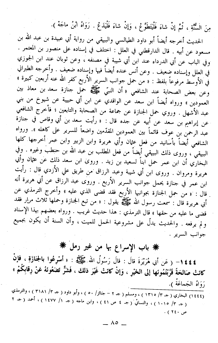 1444 - (عَنْ أَبِي هُرَيْرَةَ قَالَ: قَالَ رَسُولُ اللَّهِ - صَلَّى اللَّهُ عَلَيْهِ وَسَلَّمَ -: «أَسْرِعُوا بِالْجِنَازَةِ، فَإِنْ كَانَتْ صَالِحَةً قَرَّبْتُمُوهَا إلَى الْخَيْرِ، وَإِنْ كَانَتْ غَيْرَ ذَلِكَ، فَشَرٌّ تَضَعُونَهُ عَنْ رِقَابِكُمْ» رَوَاهُ الْجَمَاعَةُ) .