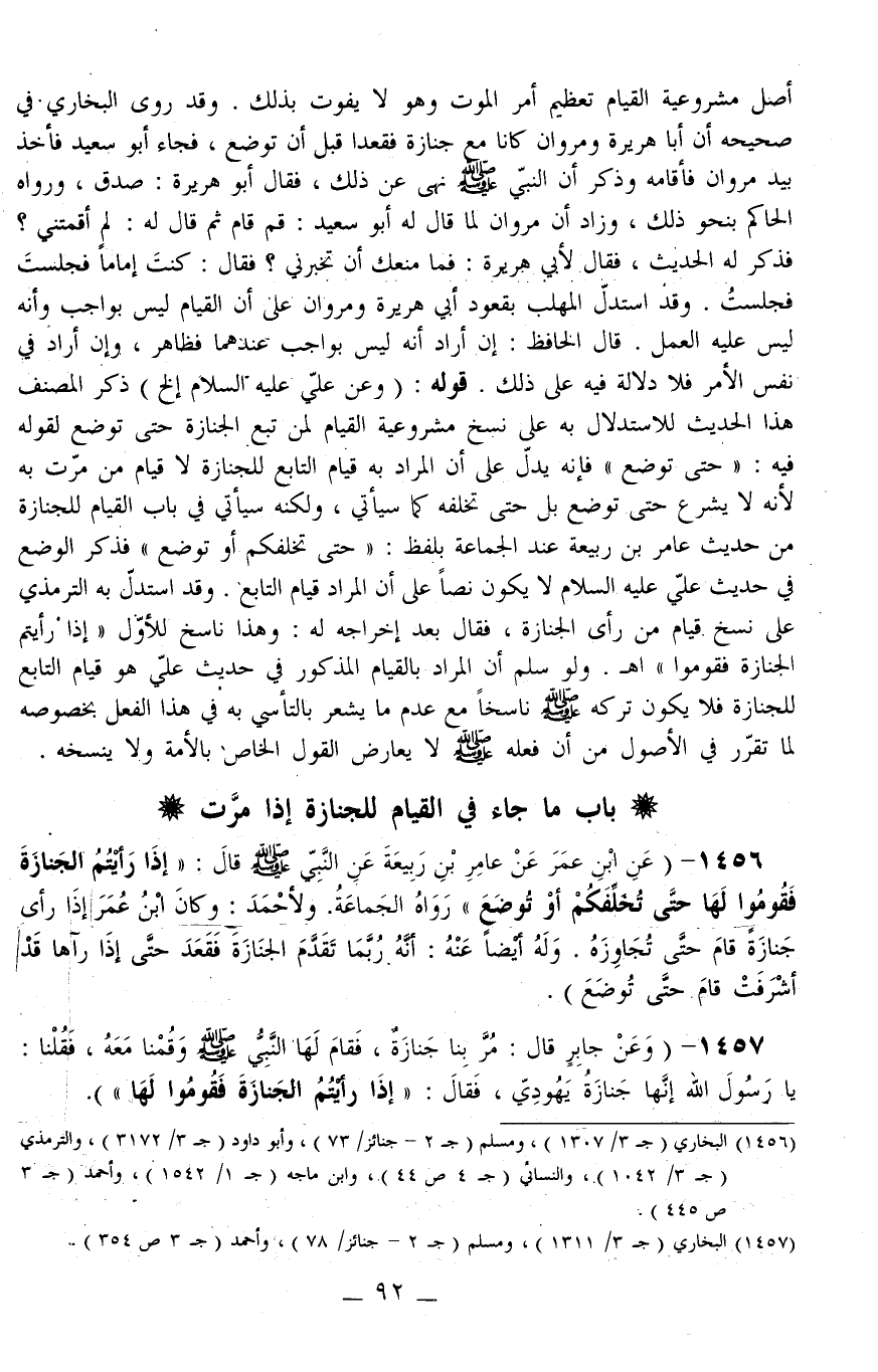 1456 - (عَنْ ابْنِ عُمَرَ عَنْ عَامِرِ بْنِ رَبِيعَةَ عَنْ النَّبِيِّ - صَلَّى اللَّهُ عَلَيْهِ وَسَلَّمَ - قَالَ: «إذَا رَأَيْتُمْ الْجِنَازَةَ فَقُومُوا لَهَا حَتَّى تُخَلِّفَكُمْ أَوْ تُوضَعَ» رَوَاهُ الْجَمَاعَةُ. وَلِأَحْمَدَ " كَانَ ابْنُ عُمَرَ إذَا رَأَى جِنَازَةً قَامَ حَتَّى تُجَاوِزَهُ. وَلَهُ أَيْضًا عَنْهُ: أَنَّهُ رُبَّمَا تَقَدَّمَ الْجِنَازَةَ فَقَعَدَ حَتَّى إذَا رَآهَا قَدْ أَشْرَفَتْ قَامَ حَتَّى تُوضَعَ) .