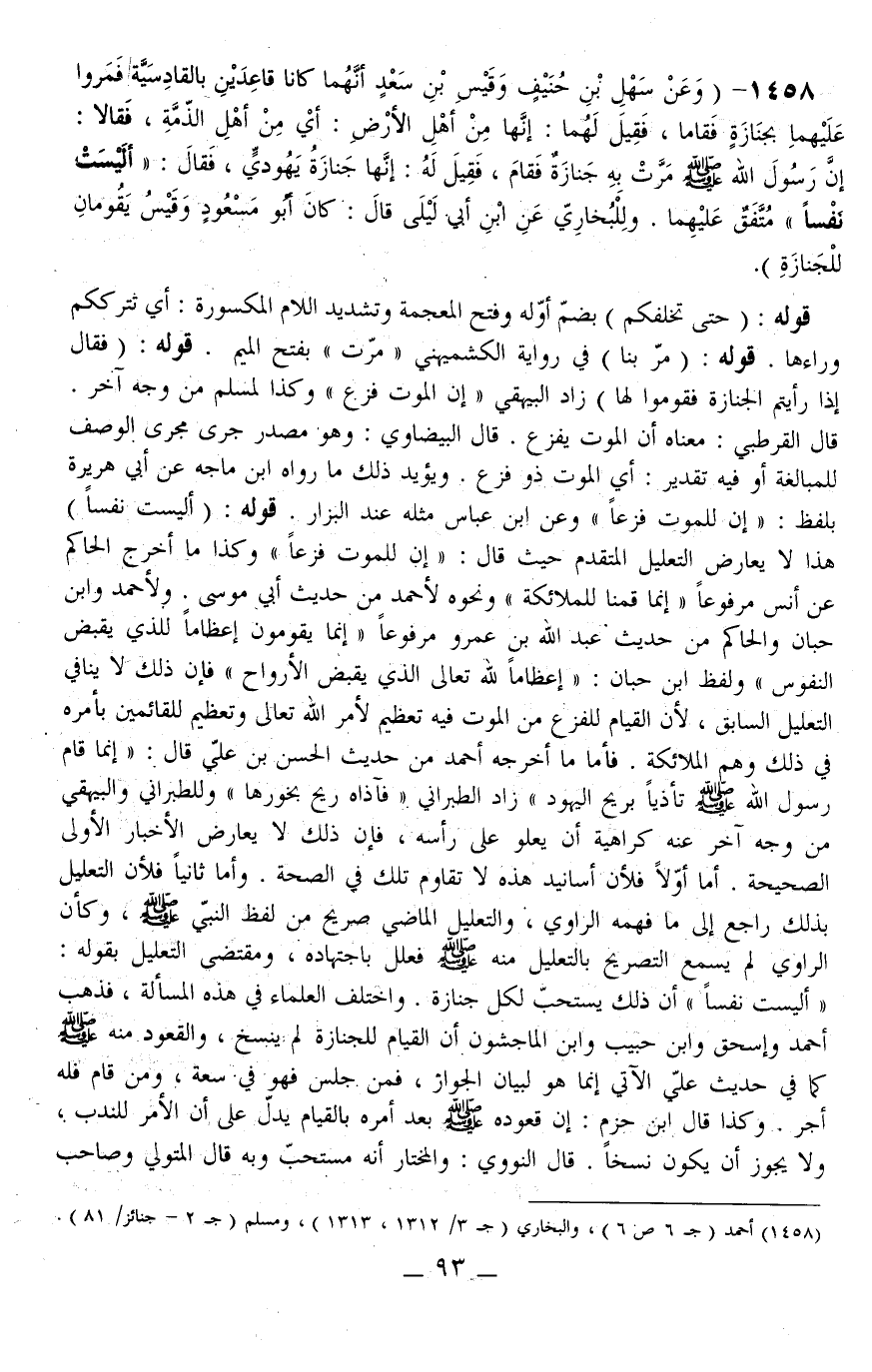 1458 - (وَعَنْ سَهْلِ بْنِ حُنَيْفٍ وَقَيْسِ بْنِ سَعْدٍ أَنَّهُمَا كَانَا قَاعِدَيْنِ بِالْقَادِسِيَّةِ فَمَرُّوا عَلَيْهِمَا بِجِنَازَةٍ فَقَامَا، فَقِيلَ لَهُمَا: إنَّهَا مِنْ أَهْلِ الْأَرْضِ: أَيْ مِنْ أَهْلِ الذِّمَّةِ، فَقَالَا: «أَنَّ رَسُولَ اللَّهِ - صَلَّى اللَّهُ عَلَيْهِ وَسَلَّمَ - مَرَّتْ بِهِ جِنَازَةٌ فَقَامَ، فَقِيلَ لَهُ: إنَّهَا جِنَازَةُ يَهُودِيٍّ، فَقَالَ: أَلَيْسَتْ نَفْسًا» مُتَّفَقٌ عَلَيْهِمَا. وَلِلْبُخَارِيِّ عَنْ ابْنِ أَبِي لَيْلَى قَالَ: كَانَ أَبُو مَسْعُودٍ وَقَيْسُ يَقُومَانِ لِلْجِنَازَةِ)