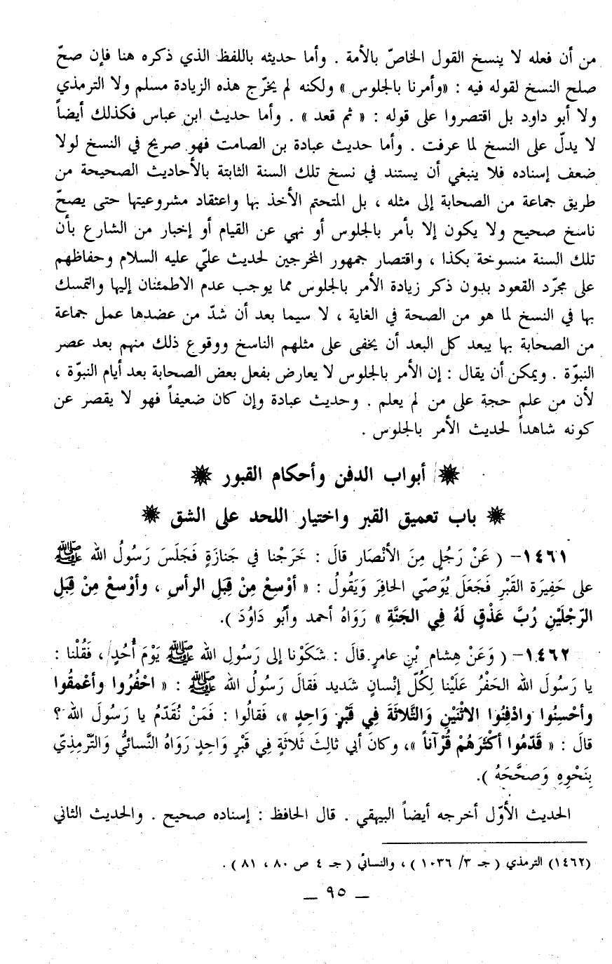 1462 - (وَعَنْ هِشَامِ بْنِ عَامِرٍ قَالَ: «شَكَوْنَا إلَى رَسُولِ اللَّهِ - صَلَّى اللَّهُ عَلَيْهِ وَسَلَّمَ - يَوْمَ أُحُدٍ، فَقُلْنَا: يَا رَسُولَ اللَّهِ الْحَفْرُ عَلَيْنَا لِكُلِّ إنْسَانٍ شَدِيدٍ فَقَالَ رَسُولُ اللَّهِ - صَلَّى اللَّهُ عَلَيْهِ وَسَلَّمَ -: احْفِرُوا وَأَعْمِقُوا وَأَحْسِنُوا وَادْفِنُوا الِاثْنَيْنِ وَالثَّلَاثَةِ فِي قَبْرٍ وَاحِدٍ، فَقَالُوا: فَمَنْ نُقَدِّمُ يَا رَسُولَ اللَّهِ؟ قَالَ: قَدِّمُوا أَكْثَرَهُمْ قُرْآنًا، وَكَانَ أَبِي ثَالِثَ ثَلَاثَةٍ فِي قَبْرٍ وَاحِدٍ» رَوَاهُ النَّسَائِيّ وَالتِّرْمِذِيُّ بِنَحْوِهِ وَصَحَّحَهُ) .