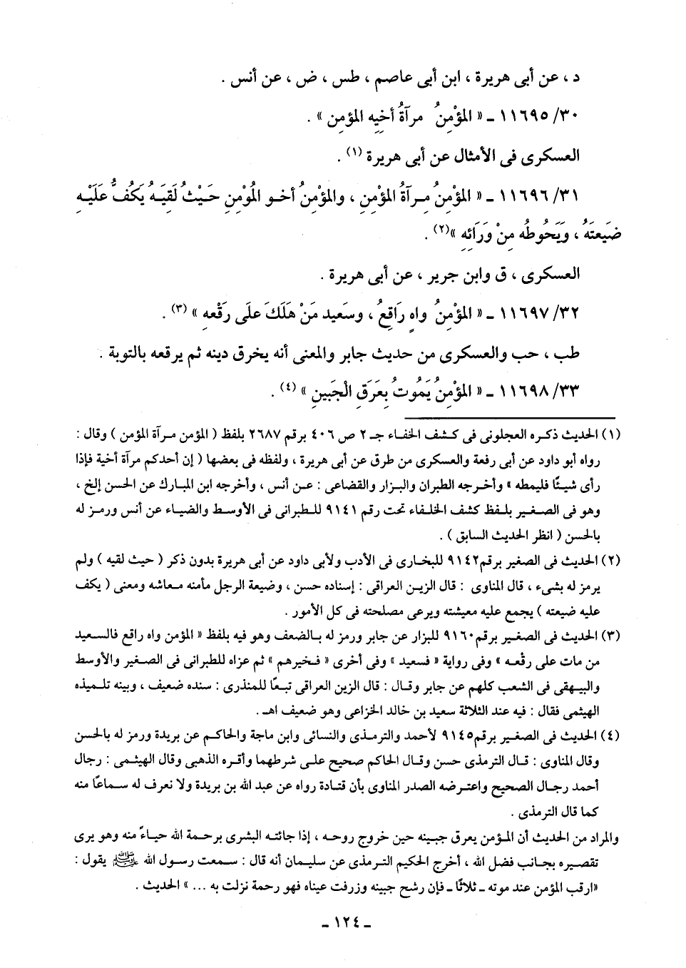 33/ 11698 - "المؤْمِنُ يَمُوتُ بِعَرَقِ الْجَبينِ" (¬4).