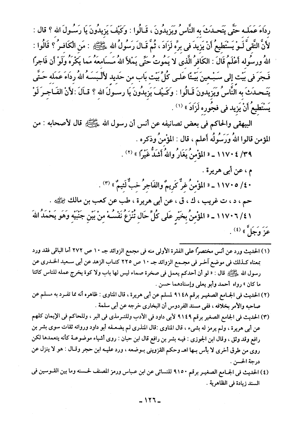 41/ 11706 - "المؤْمِنُ بِخَيرٍ عَلى كُلِّ حَالِ تُنْزعُ نَفْسُه مِنْ بَينِ جَنْبَيهِ وَهَو يَحْمَدُ اللهَ عَزَّ وَجَلَّ" (¬4).