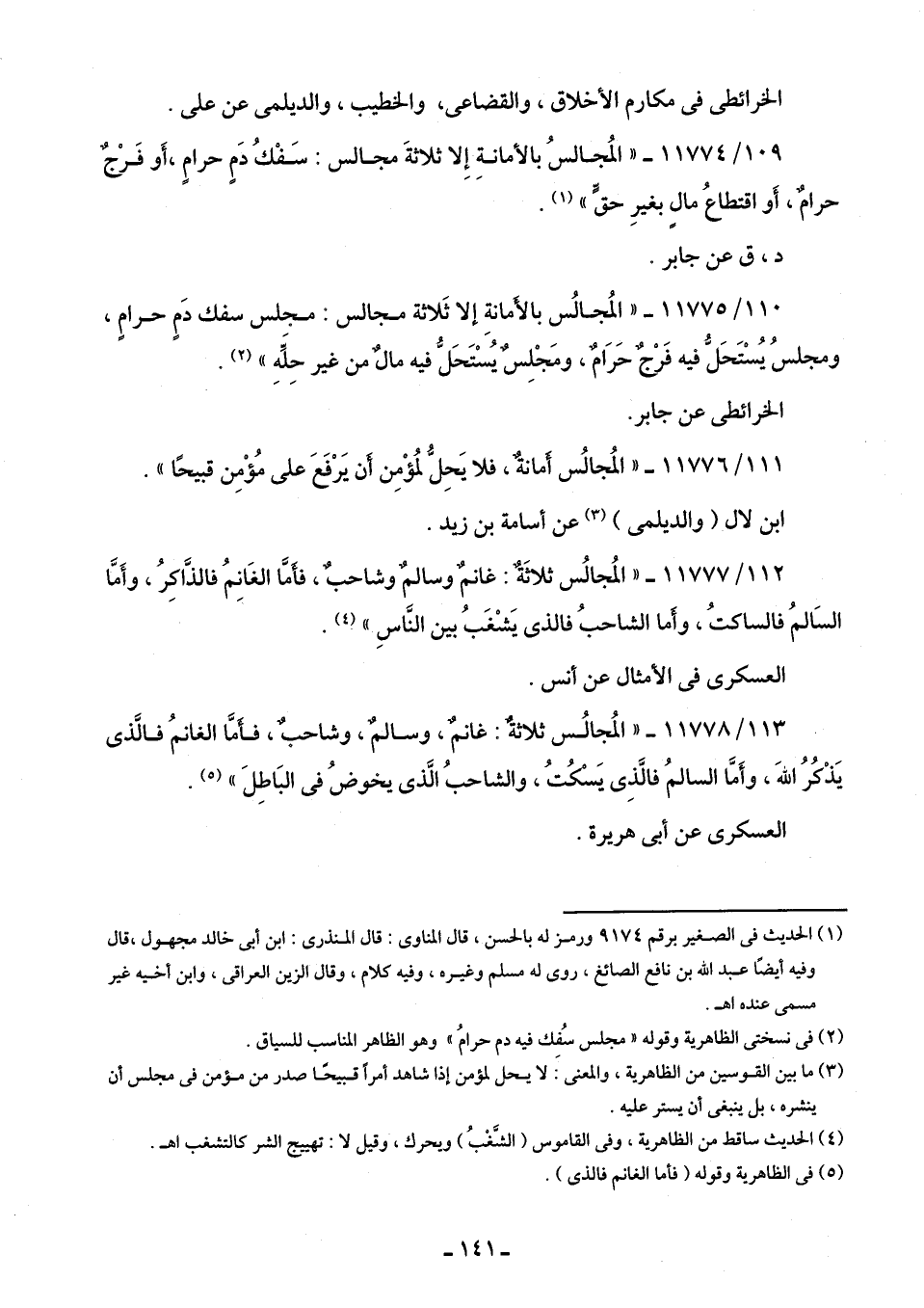 113/ 11778 - "المُجالسُ ثلاثة: غانمٌ، وسالمٌ، وشاحبٌ، فأمَّا الغانمُ فالَّذى يَذْكُرُ الله، وأَمَّا السالمُ فالَّذِى يَسكُتُ، والشاحبُ الَّذي يخوضُ في البَاطِل" (¬5).