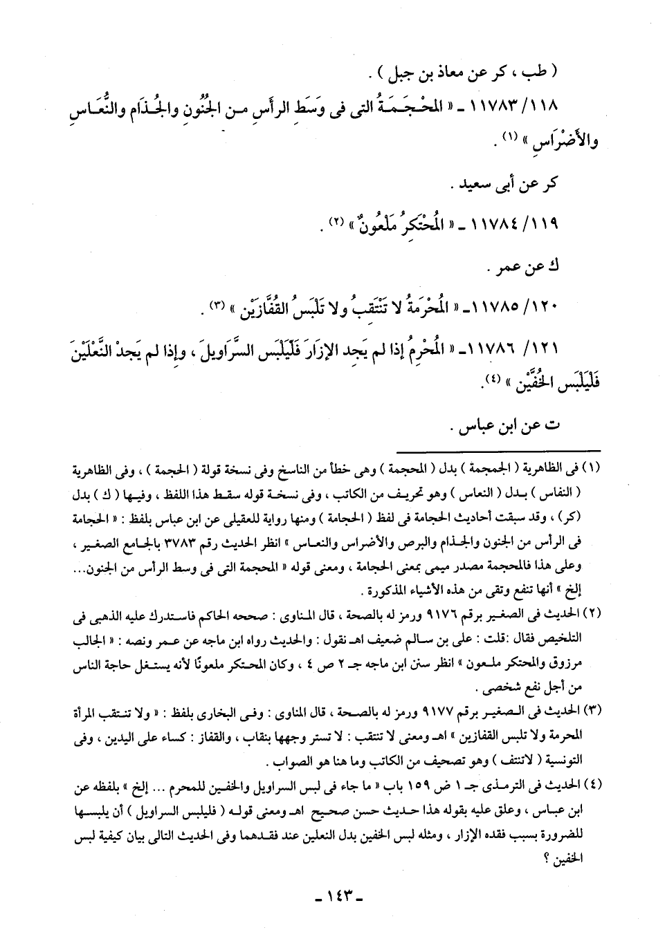121/ 11786 - "المُحرِمُ إذا لم يَجد الإزَارَ فَليلبَس السَّرَاويلَ، وإذا لم يَجدْ النعْلَينَ فليَلبس الخُفَّين" (¬4).