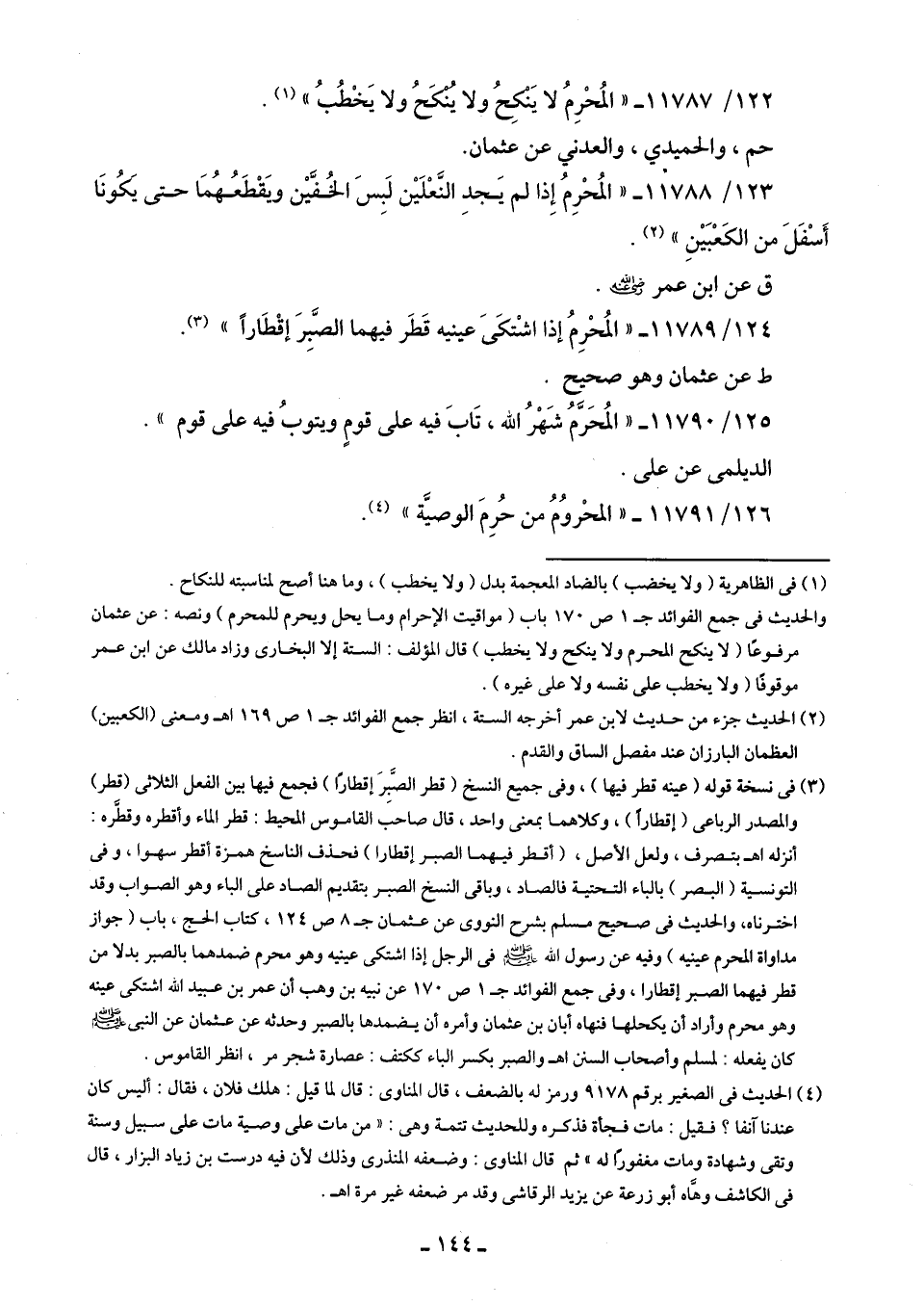(¬1) في الظاهرية (ولا يخضب) بالضاد المعجمة بدل (ولا يخطب)، وما هنا أصح لمناسبته للنكاح. والحديث في جمع الفوائد جـ 1 ص 170 باب (مواقيت الإحرام وما يحل ويحرم للمحرم) ونصه: عن عثمان مرفوعًا (لا ينكح المحرم ولا ينكح ولا يخطب) قال المؤلف: الستة إلا البخاري وزاد مالك عن ابن عمر موقوفًا (ولا يخطب على نفسه ولا على غيره).