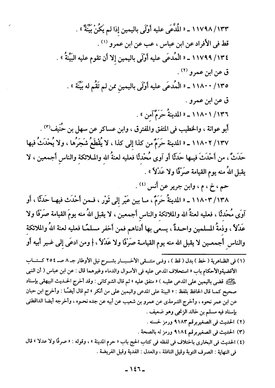 138/ 11803 - "المدينةُ حَرَمٌ، ما بين عَير إِلى ثَوْر، فمن أحْدَث فيها حَدثا، أَو آوَى مُحْدِثا، فعليه لعنةُ الله والملائكةِ والناسِ أَجمعين، لا يقبل اللهُ منه يومَ القيامة صَرْفًا ولا عَدْلًا، وذمةُ المسلمين واحدةٌ، يسعى بها أَدناهم فمن أخفر مسلما فعليه لعنة اللهُ والملائكةِ والناسِ أَجمعين لا يقبل الله منه يوم القيامة صَرْفا ولا عَدْلا، أو من ادعَى إِلى غير أَبيه أو