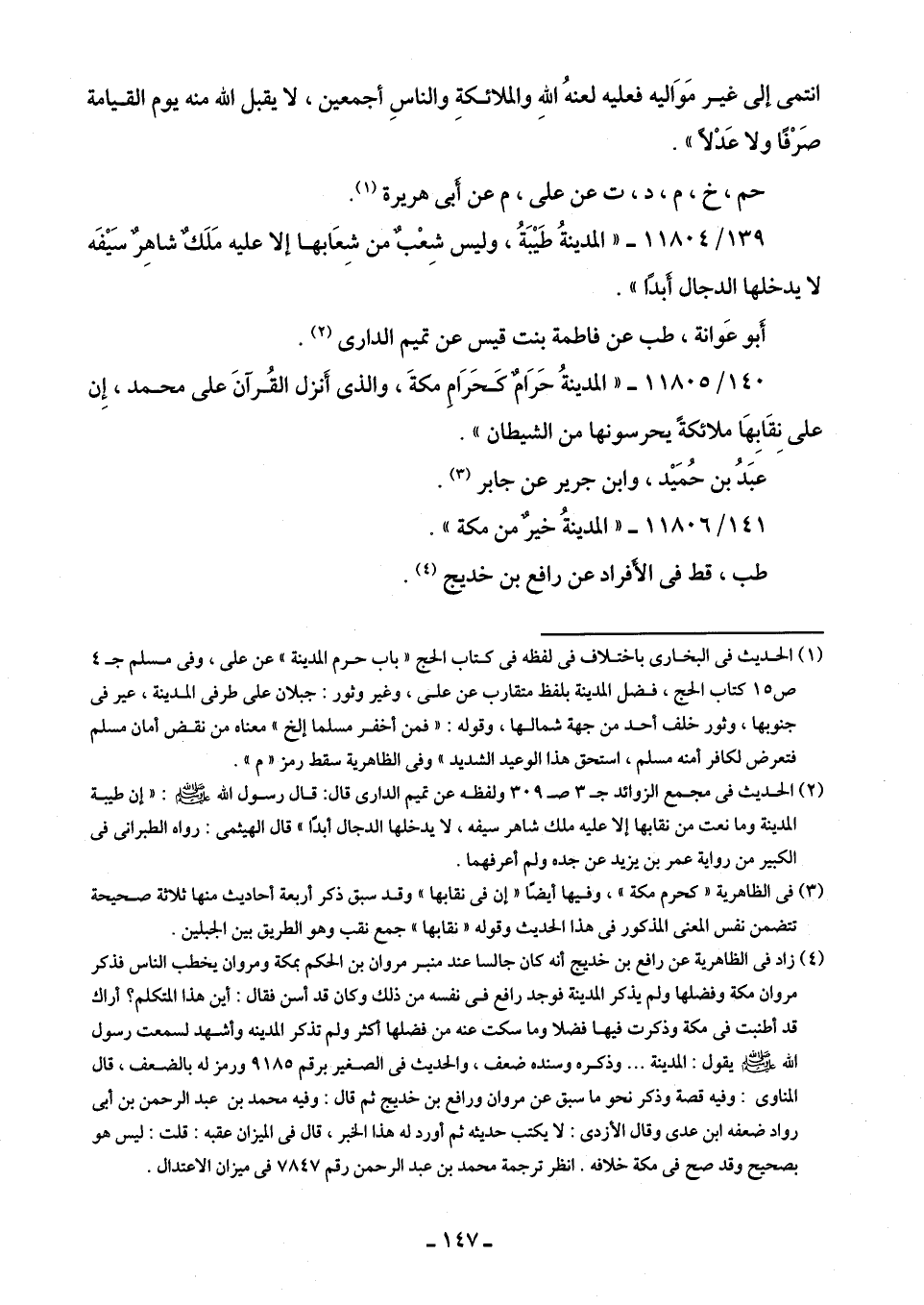 140/ 11805 - "المدينةُ حَرَامٌ كَحَرَامِ مكةَ، والذي أَنزل القُرآنَ على محمَّد، إِن على نِقَابِهَا ملائكةً يحرسونها من الشيطان".
