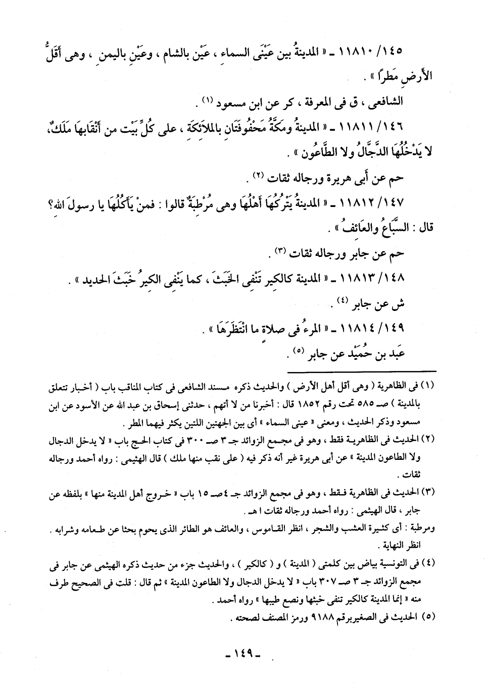146/ 11811 - "المدينةُ ومَكَّةُ مَحْفُوفَتَان بالملائِكَةِ، على كُلِّ بَيت من أنْقَابهَا مَلَك، لا يَدْخُلُهَا الدَّجَّالُ ولا الطَّاعُون".