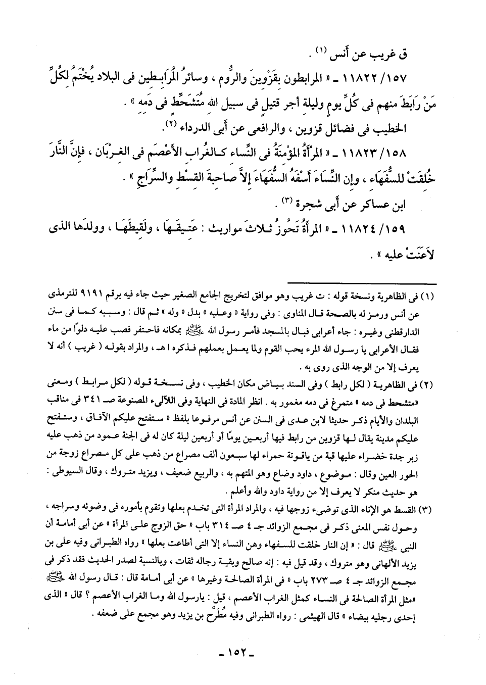 157/ 11822 - "المرابطون بِقَزْوينَ والرُّوم، وسائرُ المُرَابِطِين في البلاد يُخْتَمُ لِكُلِّ مَنْ رَابَطَ منهم في كُلِّ يومٍ وليلةٍ أجر قتيلٍ في سبيل اللهِ مُتَشَحِّطٍ في دَمِهِ".