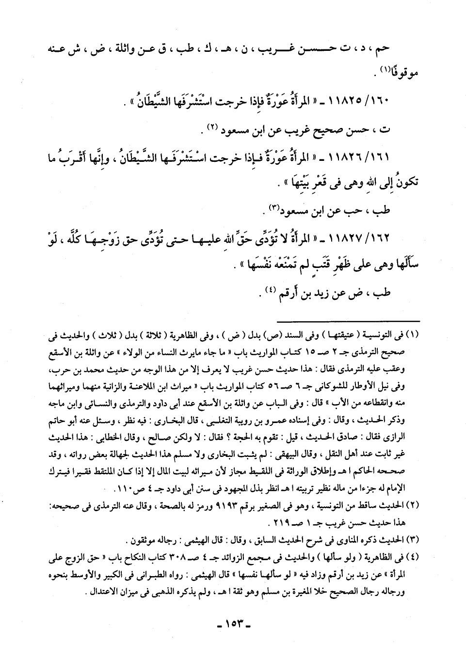 160/ 11825 - "المرأَةُ عَوْرَةٌ فإِذا خرجت اشتَشْرَفَها الشيطَانُ".