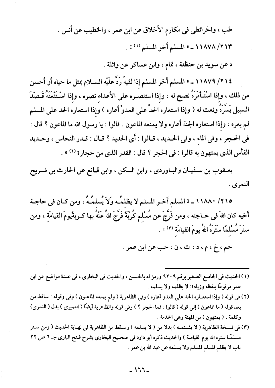 215/ 11880 - "المسلم أَخو المسلم لا يظلِمُه وَلَا يُسلِمُهُ، ومن كان في حاجة أَخيه كان اللهَ في حاجته، ومن فَرَّجَ عن مُسْلِم كُرْبَةً فَرَّجَ اللهُ عَنْهُ بها كربةً يومَ القيامَةِ، ومن ستَرَ مُسْلِمًا سَتَرَهُ اللهُ يومَ القيامَةِ (¬3) ".