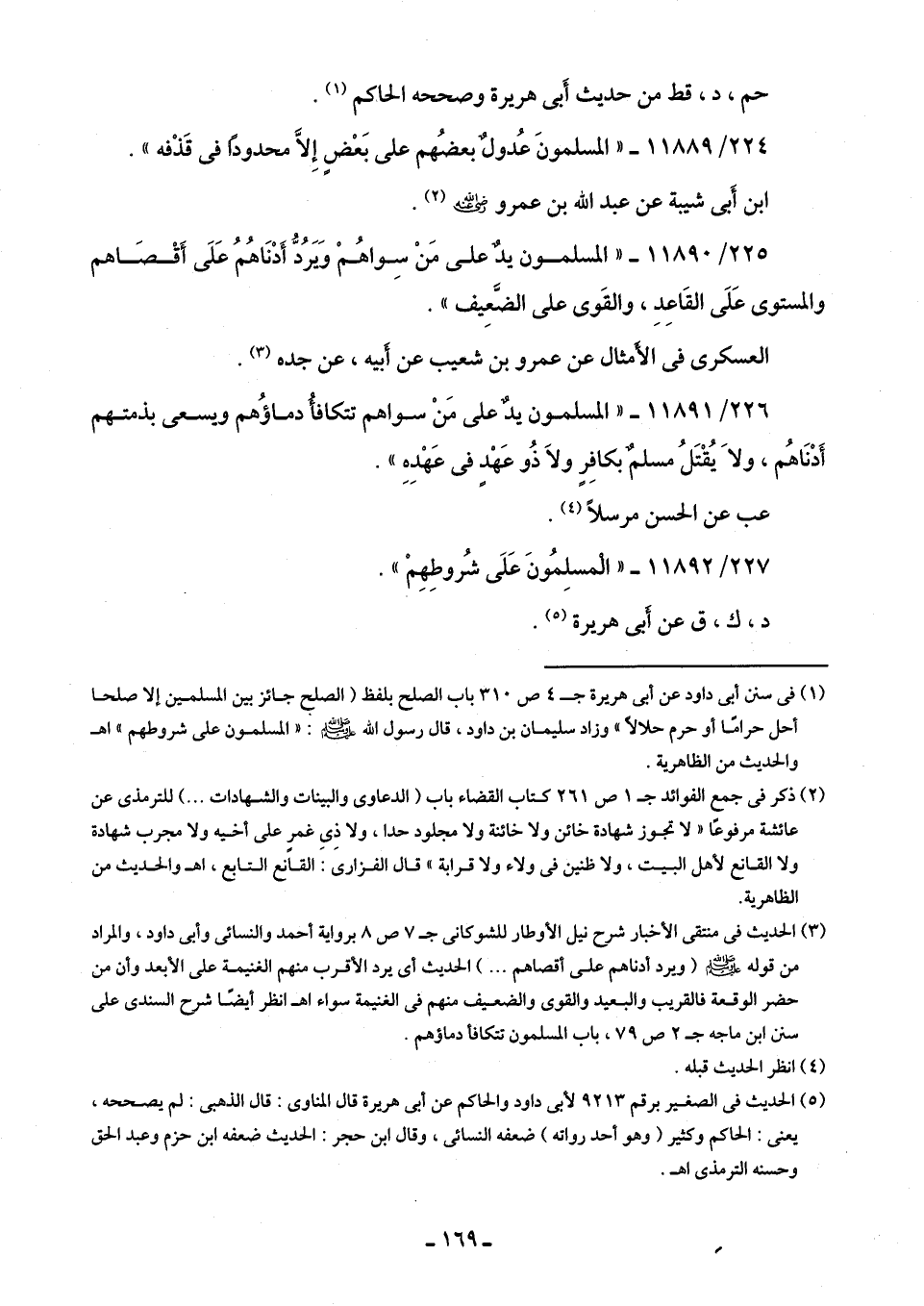 226/ 11891 - "المسلمون يدٌ على مَنْ سواهم تتكافأُ دماؤُهم ويسعى بذمتهم أَدْنَاهُم، ولا يُقْتَلُ مسلمٌ بكافِر ولَا ذُو عَهْدٍ في عَهْدِهِ".
