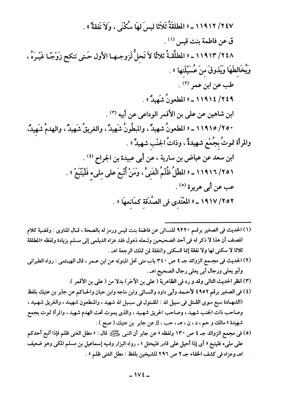 (¬4) في الصغير برقم 4952 لأحمد وأبي داود والنسائي وابن ماجه وابن حبان والحاكم عن جابر بن عتيك بلفظ (الشهادة سبع سوى القتل في سبيل الله: المقتول في سبيل الله شهيد، والمطعون شهد، والغريق شهيد، وصاحب ذات الجنب شهيد، وصاحب الحريق شهيد، والذي يموت تحت الهدم شهيد، والمرأة تموت بجمع شهيدة" مالك وحم، د، ن، هـ، حب، ك عن جابر بن عتيك (صح).