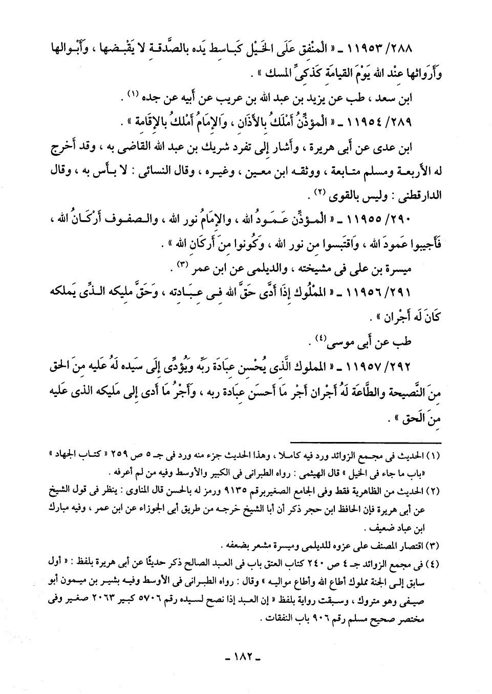 288/ 11953 - "الْمُنْفِق عَلَي الخَيل كَباسِط يَده بالصَّدقة لا يَقْبضها، وَأَبْوالها وَأَرَواثها عِنْد الله يَوْمَ القيامَةِ كَذكِيِّ المسك".
