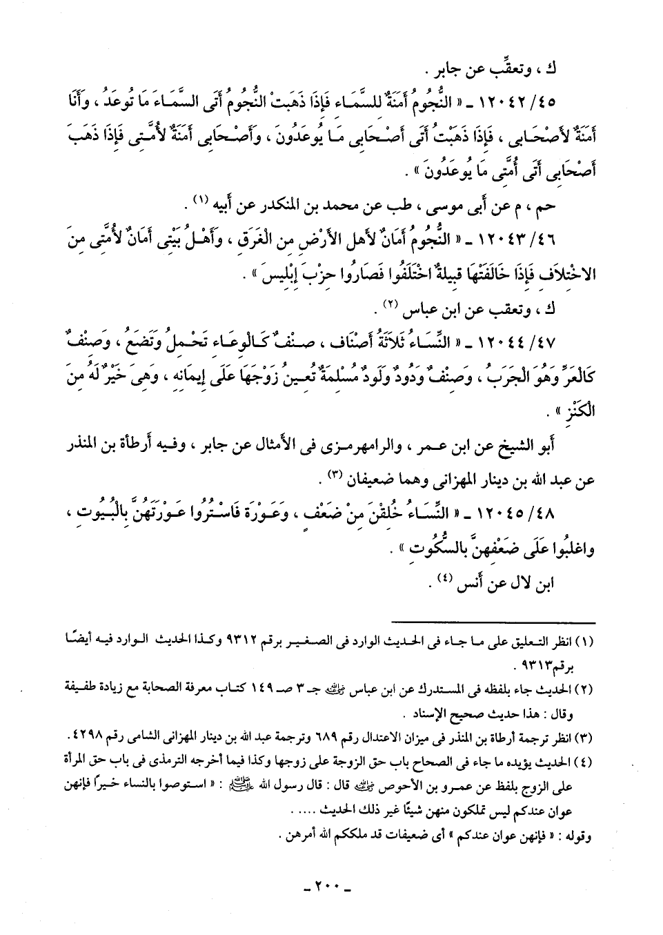 45/ 12042 - "النُّجُومُ أَمَنَةٌ لِلسَّمَاءِ فَإِذَا ذَهَبتْ النُّجُومُ أَتَى السَّمَاءَ مَا تُوعَدُ، وَأَنَا أمَنَةٌ لأصْحَابى، فَإِذَا ذَهَبْتُ أَتَى أَصْحَابِى مَا يُوعَدُونَ، وَأَصْحَابِى أمَنَةٌ لأُمَّتِى فإِذَا ذَهَبَ أَصْحَابِى أَتَى أُمَتِى مَا يُوعَدُونَ".