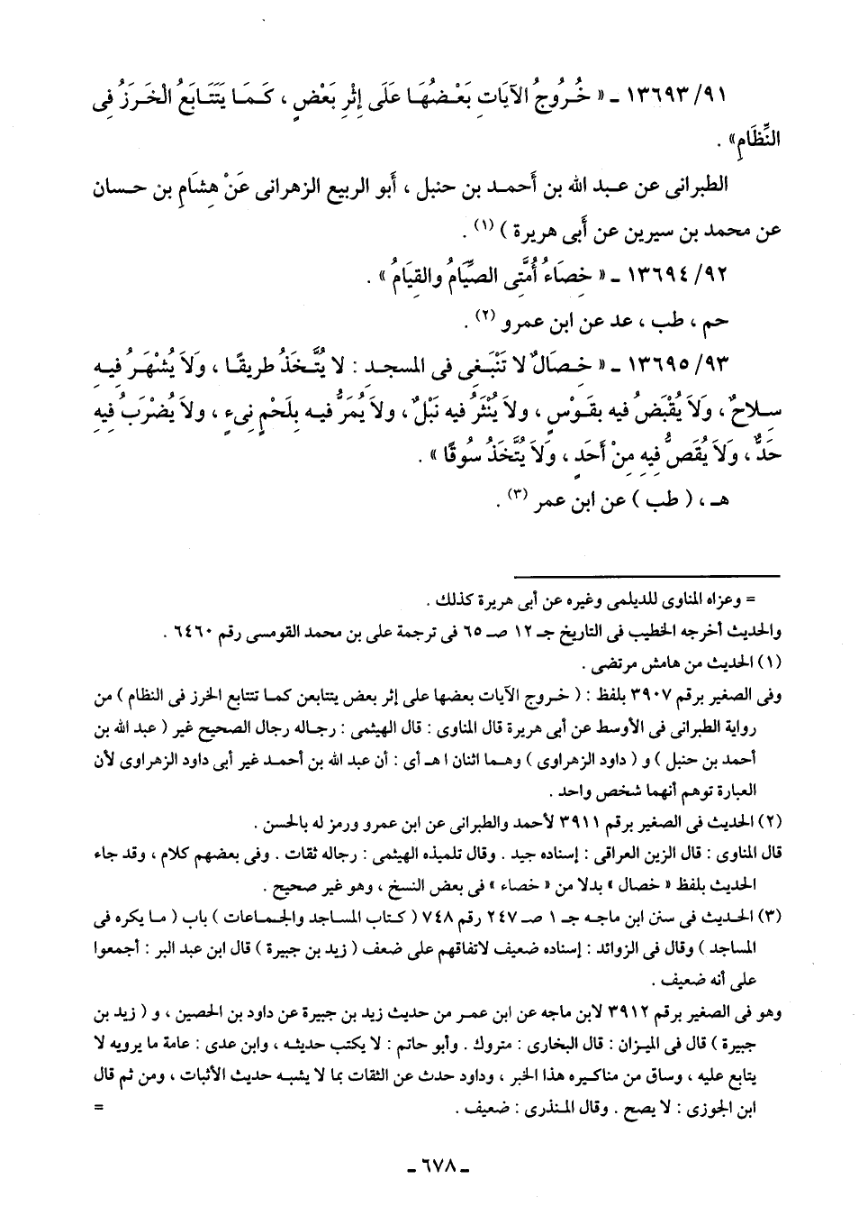 91/ 13693 - "خُرُوجُ الآيَاتِ بَعْضُها عَلَى إِثْرِ بَعْضٍ، كَمَا يَتَتَابَعُ الْخَرَزُ فِى النِّظَامِ".